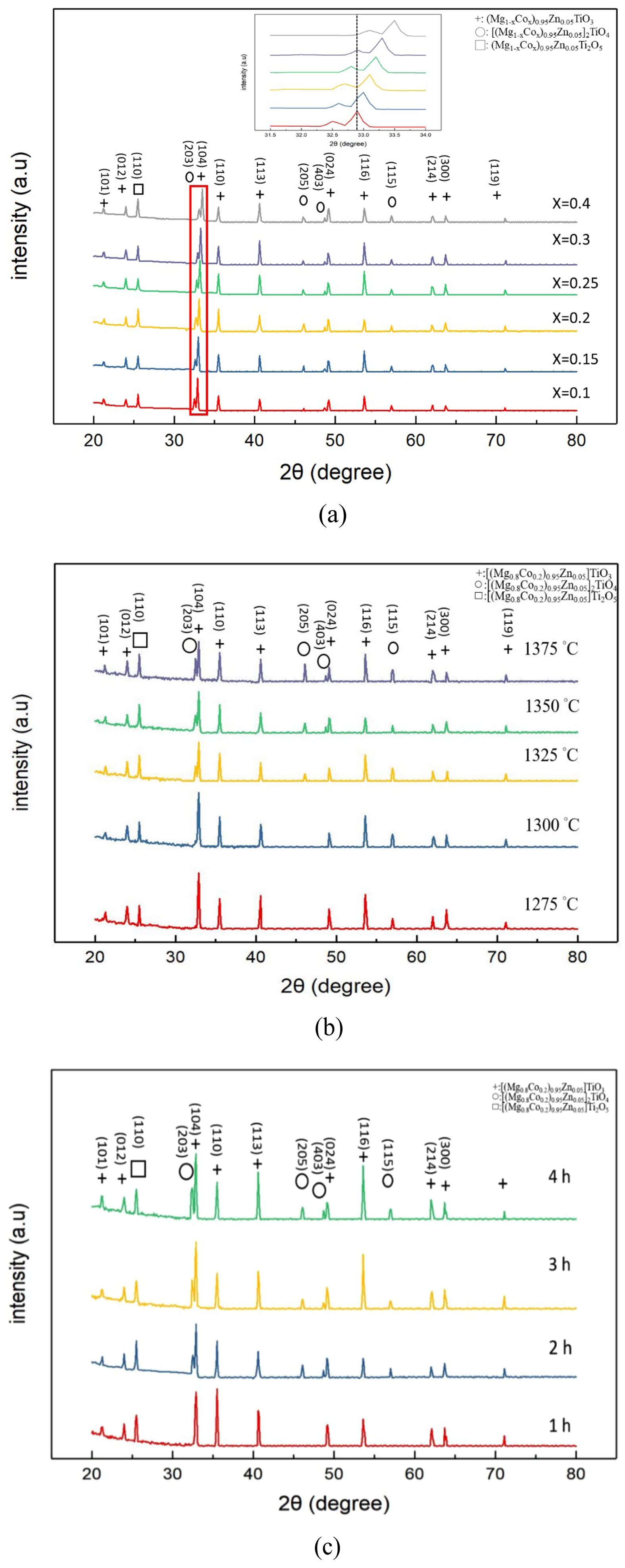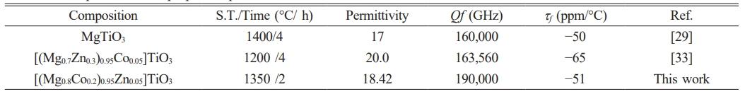 In comparison, the optimized composition [(Mg0.8Co0.2)0.95Zn0.05]TiO3 in this study was sintered at 1350 °C for 2 h: