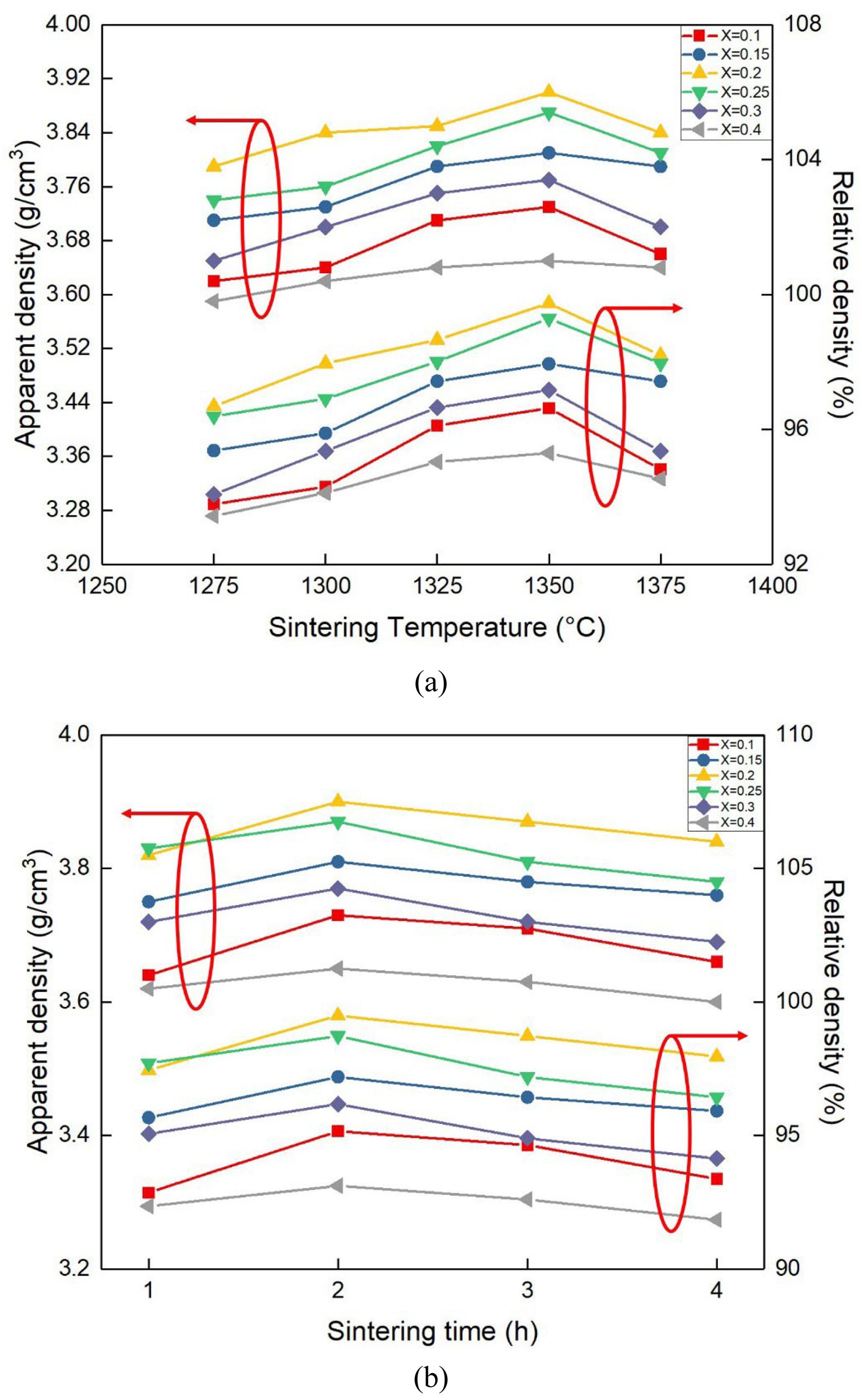 Fig. 4 Apparent density and relative density of [(Mg1- xCox)0.95Zn0.05]TiO3 with x=0–0.4 as a function of (a) sintering temperature and (b) time. |