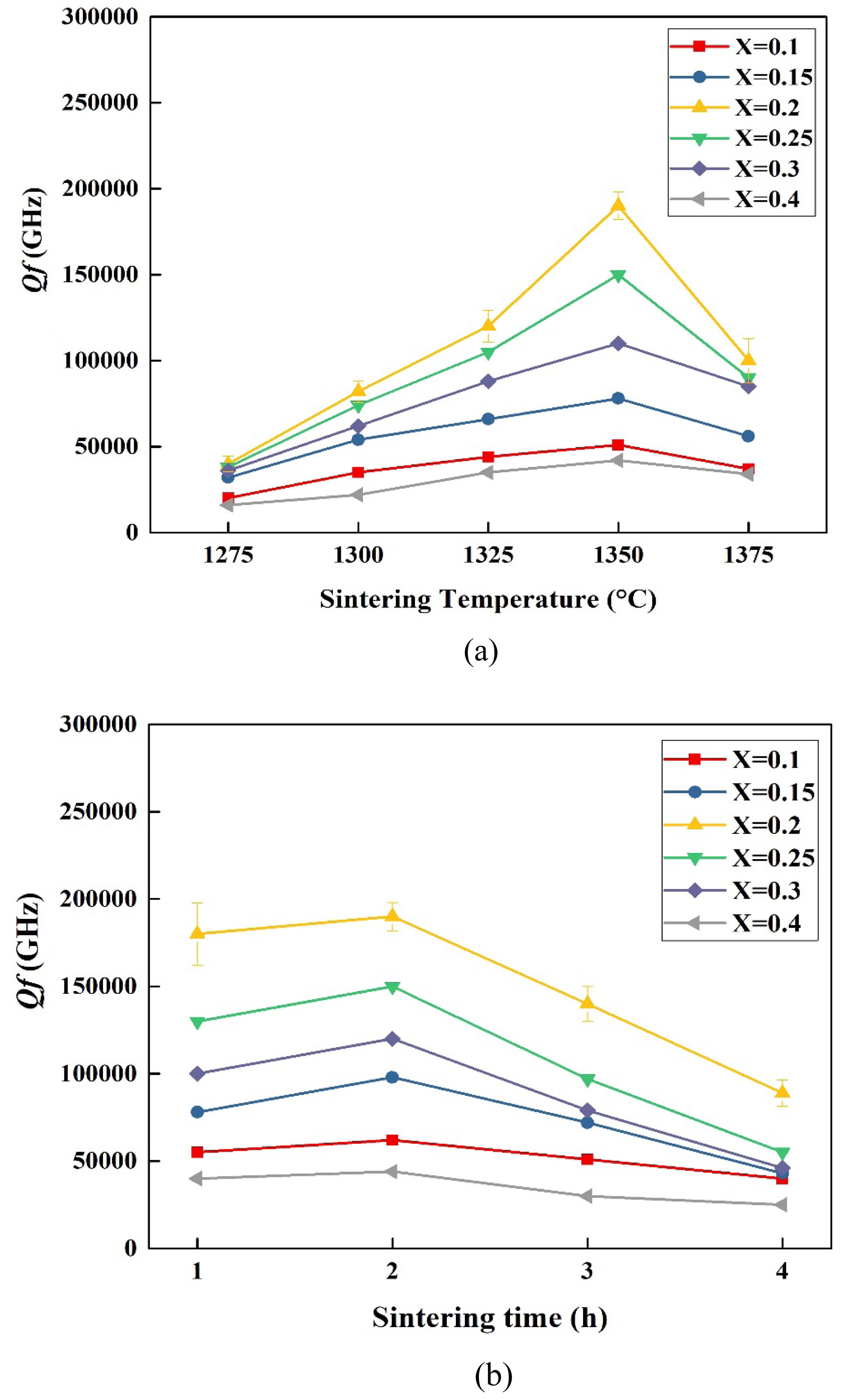 Fig. 6(a) and 6(b) depict the variation in quality factor (Qf) for different Co contents (x = 0.1–0.4) as a function of sintering temperature (1275–1375 °C for 2 h) and sintering time (1–4 h at 1350 °C). The results show that Qf improves with increased sintering temperature and time, reaching a maximum of approximately 190,000 GHz for [(Mg0.8Co0.2)0.95Zn0.05]TiO3 sintered at 1350 °C for 2 h. This condition represents the optimal balance between densification, grain growth, and phase stability, yielding the best dielectric performance among all tested compositions. To evaluate the reproducibility and reliability of the dielectric data, each Qf value was obtained from three independently sintered pellets under identical conditions. The resulting variations were within ±3–7 %, depending on the sintering temperature and dwell time. The error bars in Fig. 6 represent the standard deviation of these repeated measurements. The optimized sample (x = 0.2, 1350 °C/2 h) exhibited the highest Qf (~190,000 GHz) and the smallest deviation (±3%), confirming excellent batch-to-batch consistency.