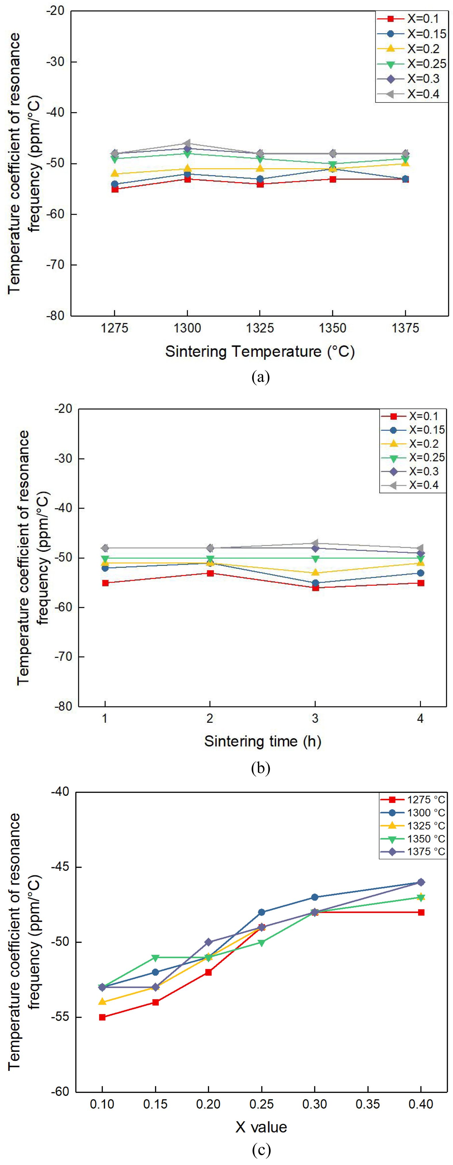 Fig. 7 illustrates the temperature coefficient of resonant frequency (τf) for [(Mg1-xCox)0.95Zn0.05]TiO3 ceramics with different Co contents (x = 0.1–0.4) as functions of sintering temperature and sintering time. Fig. 7(a) shows the τf values over a temperature range of 1275 to 1375 °C (2 h sintering), while Fig. 7(b) presents the dependence on sintering duration (1–4 h at 1350 °C). The results demonstrate that τf values for all compositions remain consistently negative, ranging from approximately −55 to −47 ppm/°C.