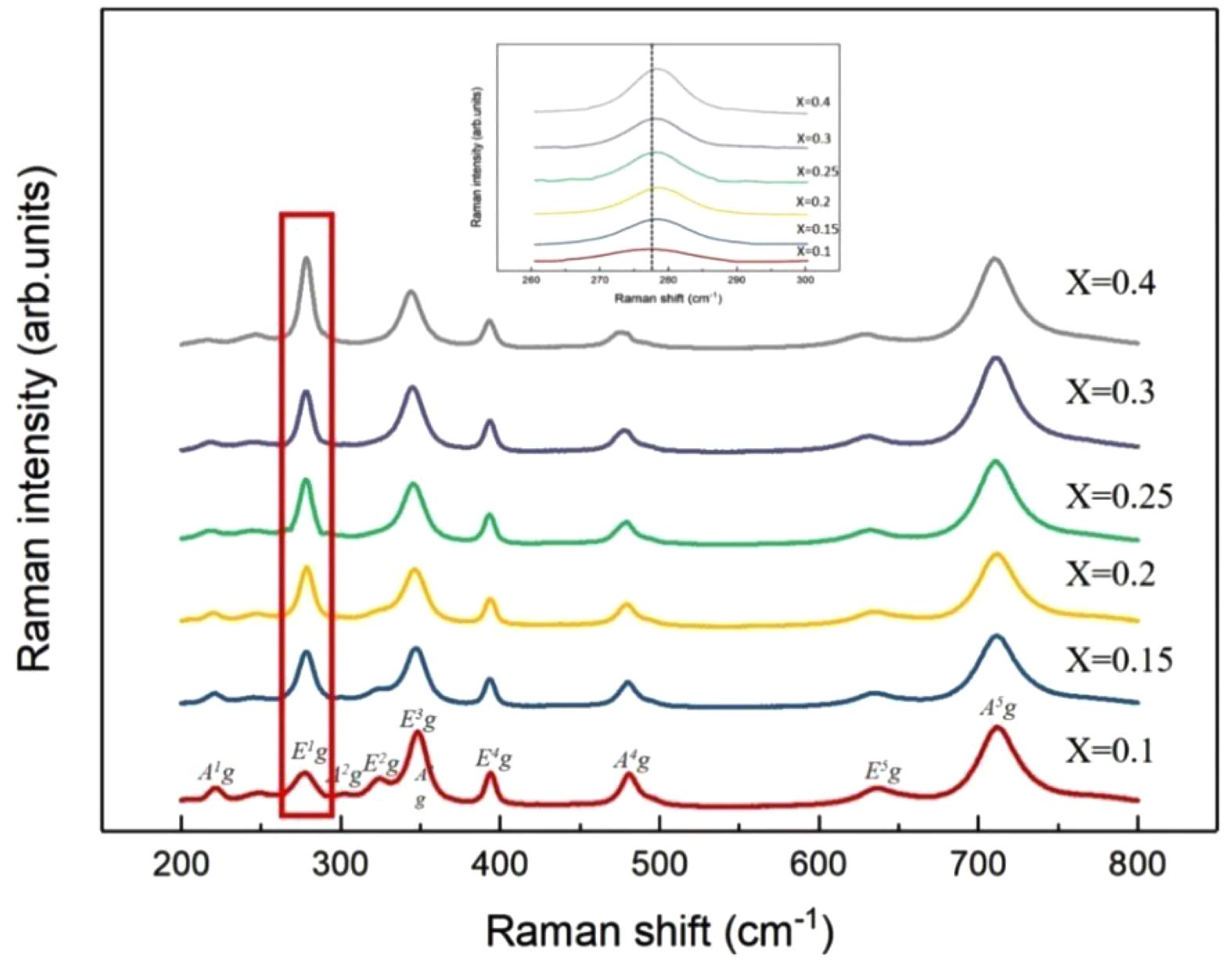 Fig. 8 displays the Raman spectra of [(Mg1-xCox)0.95Zn0.05]TiO3 ceramics (x = 0.1–0.4) sintered at 1350 °C for 2 h. The spectra exhibit several Raman-active modes characteristic of the ilmenite-type TiO₆ octahedra. The peaks near 225 cm⁻¹ (A₁g), 285 cm⁻¹ (E₁g), 330–340 cm⁻¹ (E₂g/E₃g), and 470 cm⁻¹ (A₄g) correspond to Ti–O–Ti bending and octahedral tilting vibrations, whereas the broad band at 610–710 cm⁻¹ (E₅g/A₅g) arises from Ti–O symmetric stretching [7, 38].