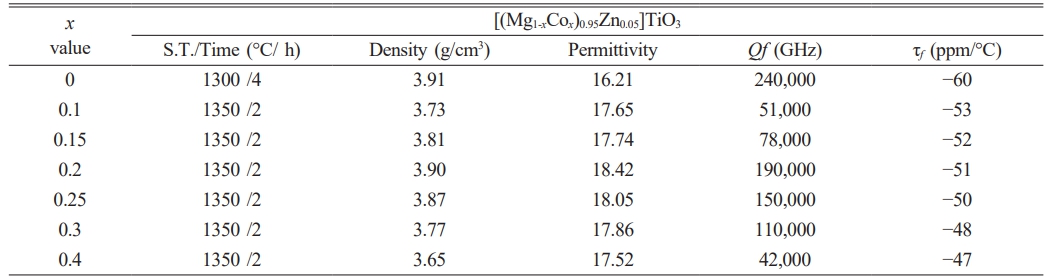 Table 3 Dielectric properties in detail of [(Mg1-xCox)0.95Zn0.05]TiO3 ceramics with optimized sintering temperature 1350 °C for 2 h under x=0.4. |