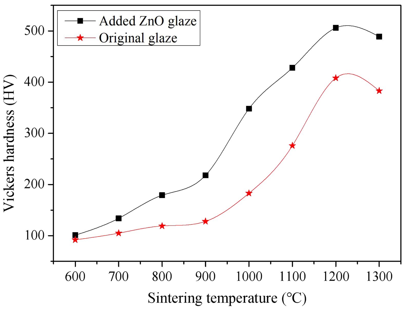 From Fig. 1, it is evident that as the sintering temperature rises from 600 to 1300 ℃, the performance of the glaze also enhances with the increasing of the sintering temperature before 1200 ℃. The hardness of the original glaze consistently remains below that of the added ZnO glaze. Notably, both the added ZnO glaze and the original glaze exhibit the significant alterationminimal change between 600 to 900 ℃ and the minimal change occurring from 900 to 1200 ℃. The maximum Vickers hardness for original glazes can reach 505.3HV, while the added ZnO glaze can achieve 527.6HV. When examining the curves, it becomes apparent that the surface hardness of the added ZnO glaze is superior at various temperatures. This suggests that the addition of 3% ZnO does indeed elevate the hardness of the glaze and enhance its physical properties. The reason for this is that during the sintering process, the certain components within the glaze melt and form a glass phase [11, 12]. This glass phase fills the interstices between the grains, resulting in a more complete structure of the glaze. Furthermore, an increase in sintering temperature results in more complete chemical reactions within the glaze. The reaction rate under high - temperature conditions is accelerated, enabling the formation of more stable compounds. When the sintering temperature exceeds 1200 degrees Celsius, the surface Vickers hardness of the glaze exhibits a decreasing trend. This is because the sintering temperature is too high, leading to an excessive amount of liquid phase in the body, which causes the crystals to become coarse and internal pores to form easily.
