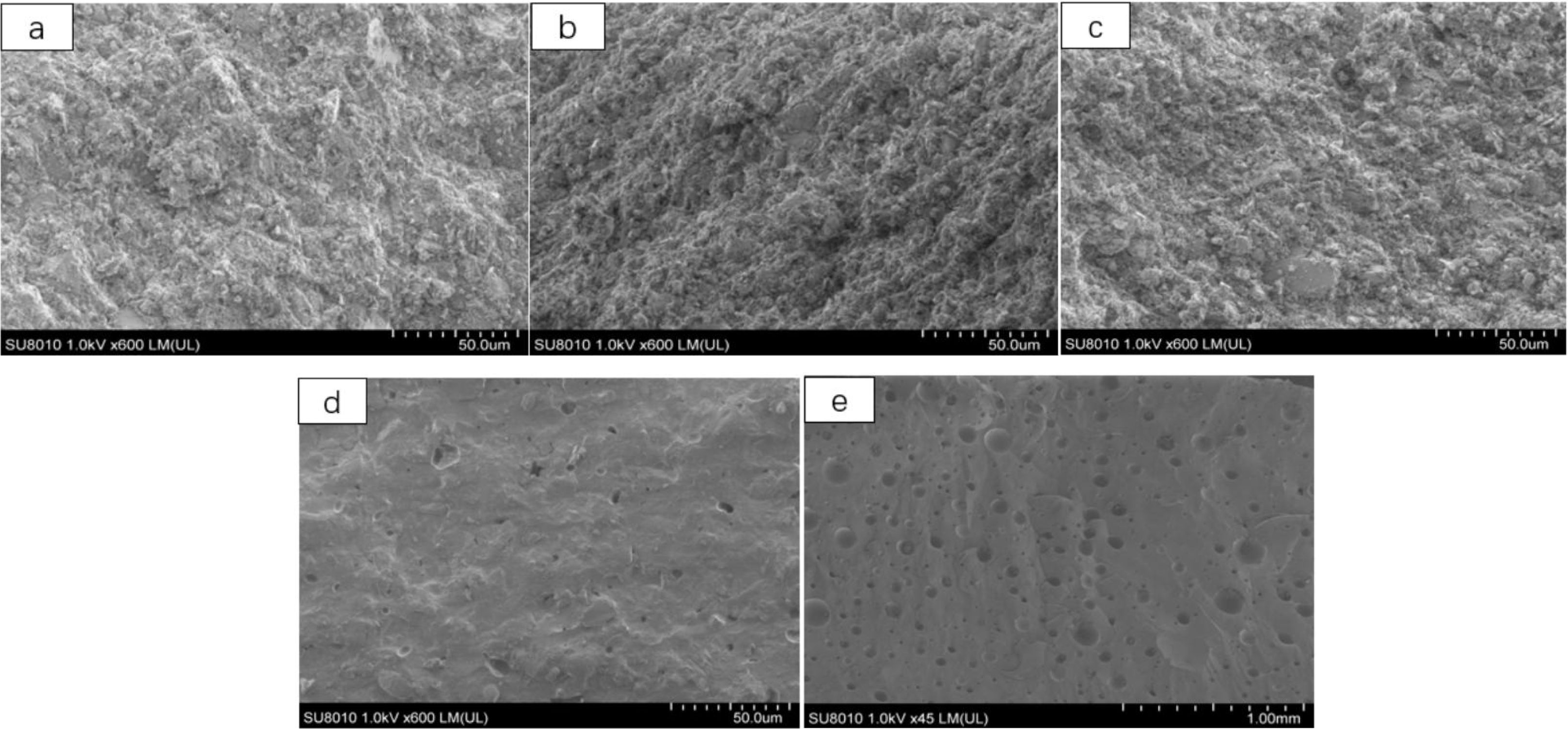 Fig. 3 Effect of sintering temperature on the microstructure of the added ZnO glaze (a-600 ℃, b-800 ℃, c-900 ℃, d-1200 ℃, e-1300 ℃). |