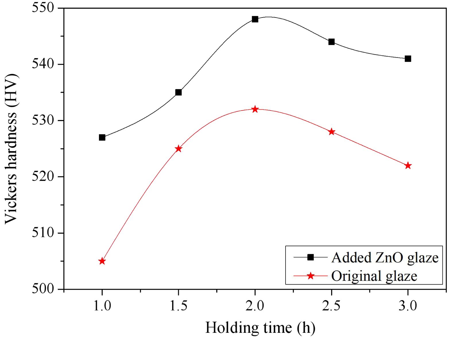 From Fig. 4, it is evident that as the holding time increases, the Vickers hardness exhibits a trend of initial increase followed by a decrease. This phenomenon occurs because that the particles within the glaze start to crystallize and the grains gradually as the holding time extends enlargein the early stages of sintering. These larger grains are packed more tightly and resulting in a more compact structure of the glaze. Concurrently, the pores and voids within the glaze diminish during the sintering process. As the holding time progresses, the contact area between particles expands, pores are eliminated, the density of the glaze increases, and consequently, the hardness rises, the hardness reached its peak after holding time for 2 h. The Vickers hardness of the original glaze was 532.1HV, while that of the added ZnO glaze was 548.9HV. Overall, the hardness of the added ZnO glaze surpassed that of the original glaze at all insulation time intervals, reaffirming the impact of zinc oxide in enhancing the hardness of glazes.