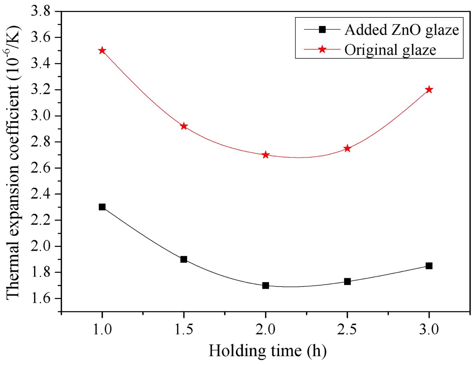 Fig. 5 Effect of holding time on the thermal expansion coefficient of the glaze. |