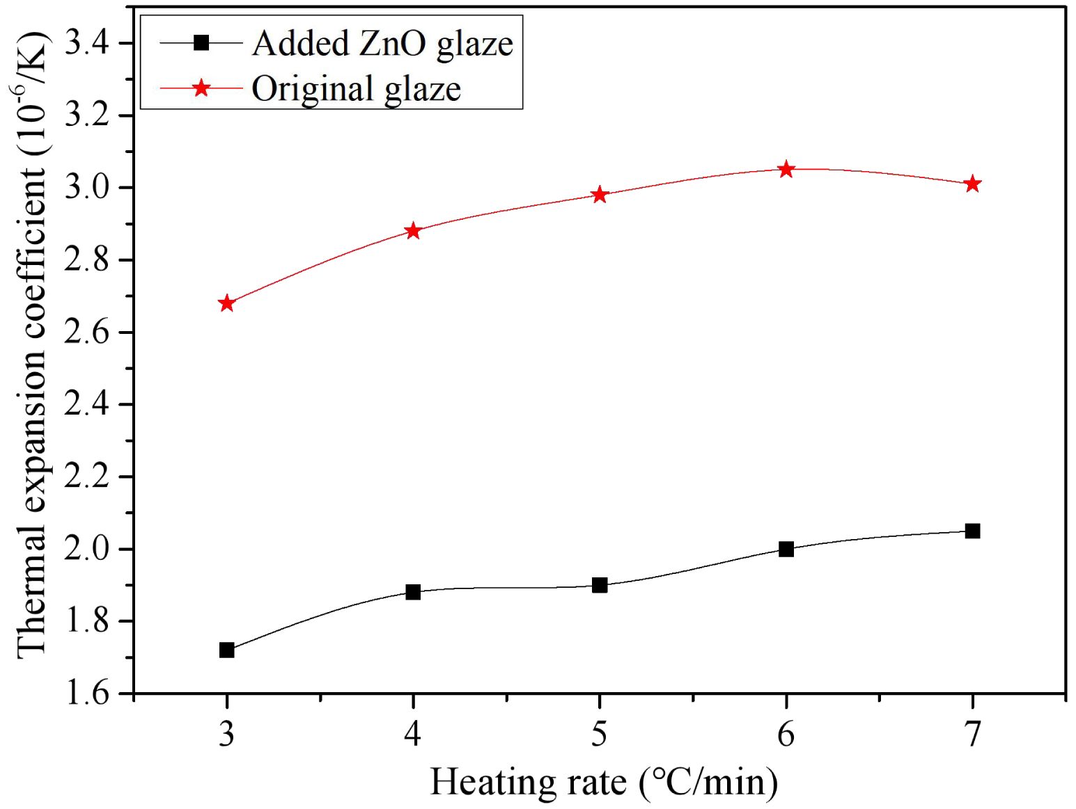 Fig. 8 Effect of heating rate on the thermal expansion coefficient of the glaze. |