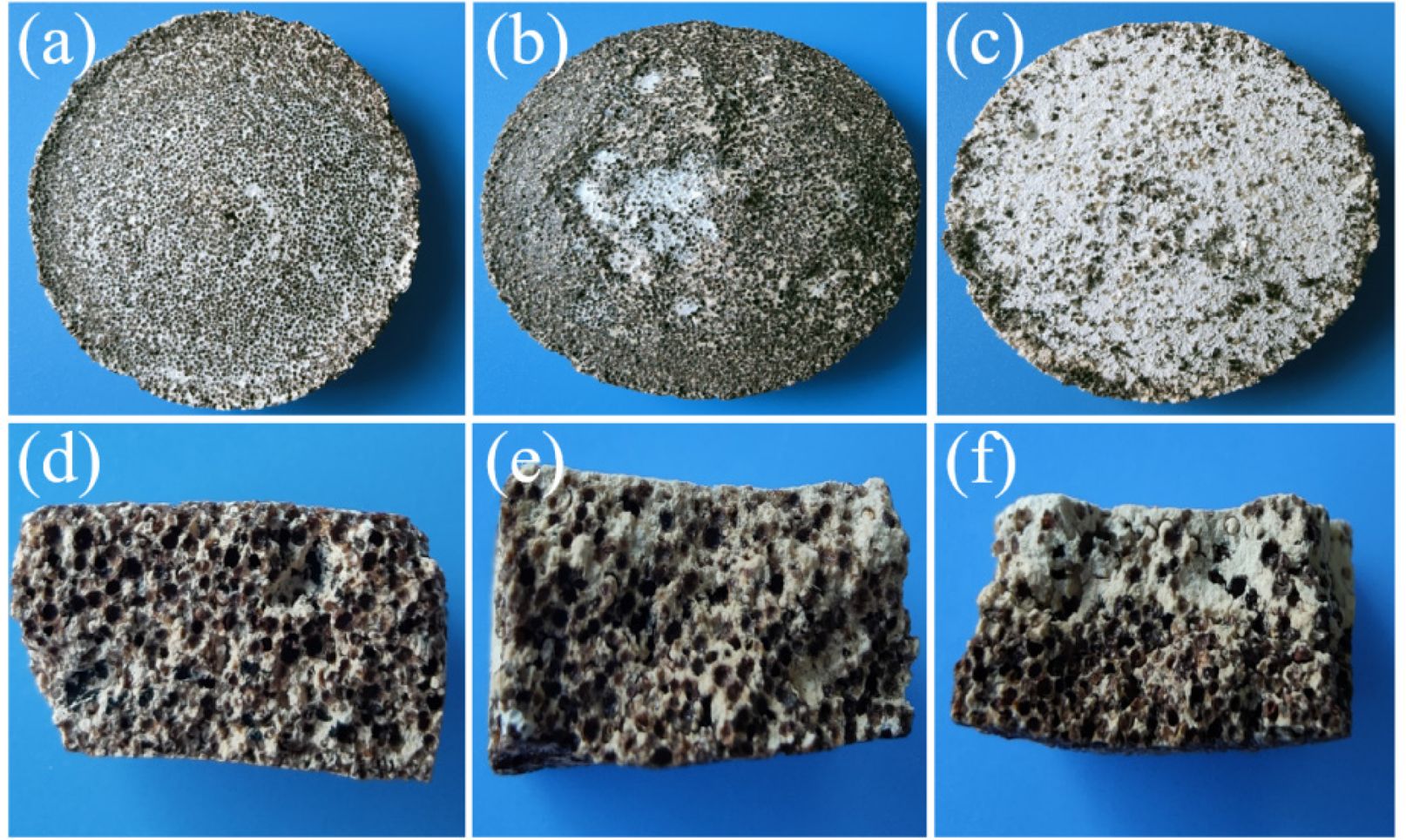 When CMC, sodium polyacrylate and polyethylene glycol are used as dispersants, the optical photos of the surface and cross section of porous ceramics prepared from P1 are shown in Fig. 1. In Fig. 1a and d, the color distribution on the surface and cross section of porous ceramics prepared with CMC as dispersant is uniform, and the upper and lower surfaces of samples are approximately straight. When polyethylene glycol is used as dispersant, the perlite and diatomite in the porous ceramics slightly float up and concentrate in the middle area of their upper surface (Fig. 1b), and the shape of porous ceramics is deformed (Fig. 1e), which is consistent with the reported results [37]. Overall, the porous ceramics exhibit an upward bending tendency, with a bending angle of approximately 7-12° relative to the horizontal plane. When sodium polyacrylate is used as a dispersant, the upper surface of the porous ceramic is white (Fig. 1c), and its cross-section also shows upward curvature with a bending angle of about 5-8°. Cross-sectional analysis reveals that the upper part is white while the lower part is relatively dark, indicating uneven dispersion of FAHSs within the slurry. The structural inhomogeneity of ceramic materials will affect its mechanical properties and easily cause bending deformation [38]. When the upper surface of the sample is enriched with lightweight expanded perlite and diatomite, the shrinkage of the upper surface during the sintering process exceeds that of the lower surface, ultimately resulting in upward bending deformation of the sample. Therefore, using CMC as dispersant is beneficial to prepare porous ceramics with uniform structure and good mechanical properties.