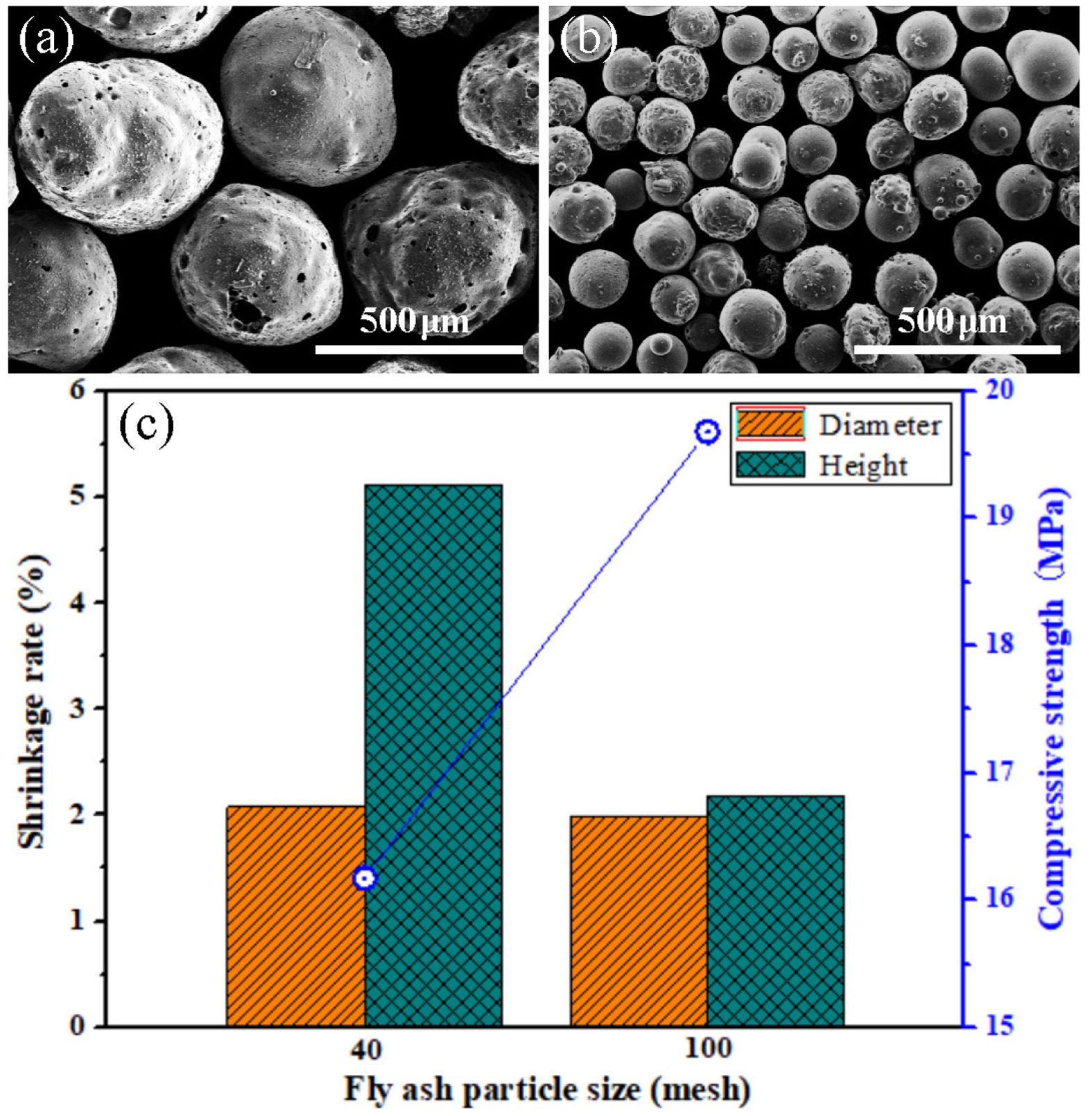 When the particle sizes of FAHSs are different, the compressive strength, diameter and height shrinkage rate of porous ceramics prepared from P1 and P2 are shown in Fig. 3. In Fig. 3a and b, the shapes of the 40 mesh and 100 mesh FAHSs are approximately spherical, with some particles exhibiting rough and porous surfaces. In Fig. 3c, when the particle size of FAHSs is 40 mesh, the diameter and height shrinkage rate shrinkage rate of the porous ceramics prepared from P1 are 2.08% and 5.11%, respectively. When the particle size of FAHSs is 100 mesh, the diameter and height shrinkage rate of porous ceramics prepared from P2 are 1.99% and 2.18%, which is much lower than that of porous ceramics obtained from other methods [40]. Obviously, the shrinkage of porous ceramics in diameter and height direction decreases with the decrease of FAHS particle size. It indicates that with a decrease in particle size, the pore size distribution becomes narrower and the pores are homogenous. Fine-grained particles can decrease the sizes of pores resulting from particle packing [41], this is conducive to the reduction of the sintering shrinkage of samples. In addition, the compressive strength of porous ceramics prepared from P2 is 3.51 MPa higher than that of porous ceramics prepared from P1. It can be seen that porous ceramics with high strength can be prepared using the fine-grained FAHSs, which proves that the reduction of raw material particle size can improve the mechanical properties of porous ceramics [40, 41].