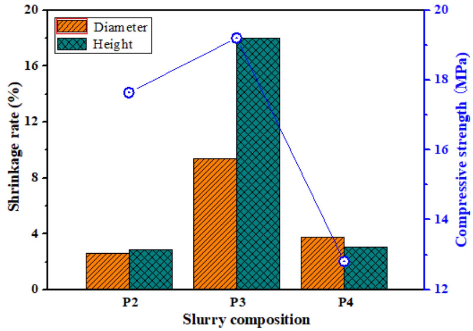 Fig. 5 shows the shrinkage rate and compressive strength of porous ceramics prepared with different slurry composition. When the slurry consists of FAHSs, diatomite and perlite powder, the compressive strength, diameter and height shrinkage rate of the porous ceramics prepared from P2 are 17.64 MPa, 2.62% and 2.86%, respectively. When the slurry composition is FAHSs and perlite powders, the diameter and height shrinkage rate of the porous ceramics prepared from P3 increase to 9.37% and 17.99%, respectively, and their compressive strength increases to 19.2 MPa, which is higher than that of porous ceramics prepared from P2. When the slurry composition is FAHSs and diatomite powder, the diameter and height shrinkage rate of porous ceramics prepared from P4 decrease to 3.74% and 3.02%, respectively, but their compressive strength decreases to 12.81 MPa. It can be seen that the shrinkage of porous ceramics prepared from P2 is smaller, while the compressive strength of porous ceramics prepared from P3 is higher.