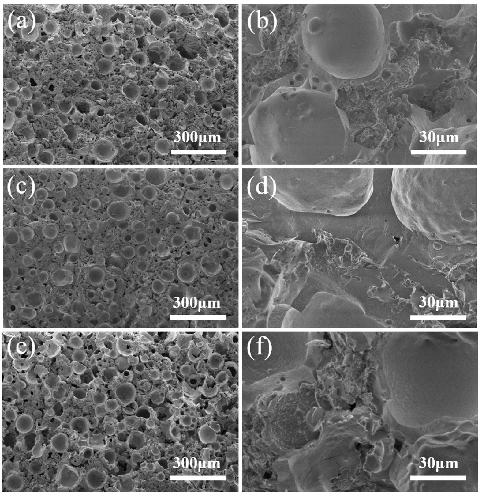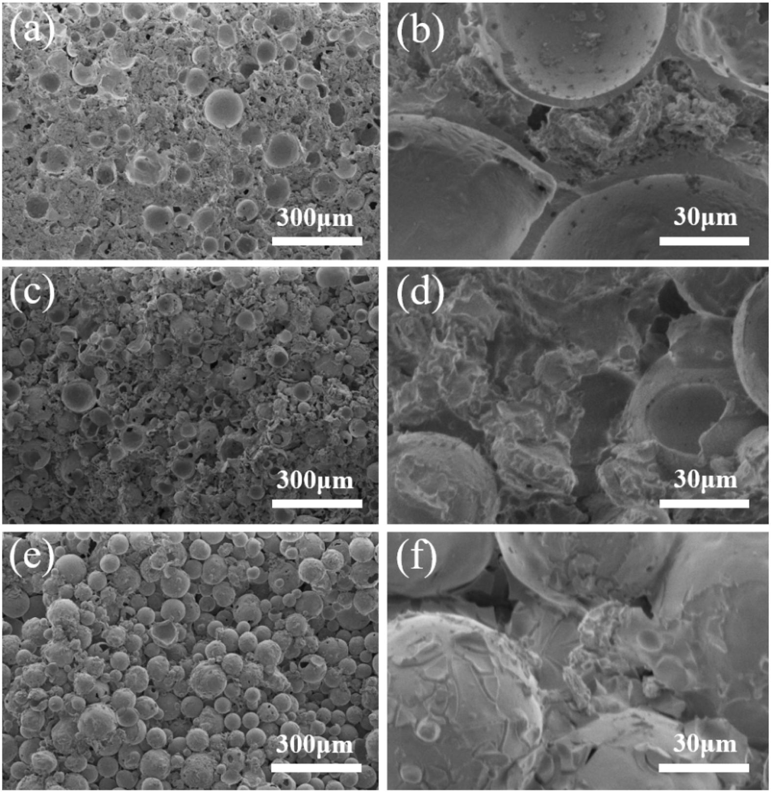 Fig. 7 shows the microstructures of porous ceramics prepared using different kinds of sols as binders. In the porous ceramics prepared with silica sol as binder (Fig. 7(a-b)), the FAHSs are tightly bonded, and the fracture surface of the FAHSs in porous ceramics is in their middle position. The fracture mechanism changes from fracturing along FAHSs to fracturing across FAHSs with the increase of mechanical strength of FAHS ceramic foams [40]. This further shows that the porous ceramics prepared by silica sol as binder have higher compressive strength. In Fig. 7(c-d), some complete FAHSs in the cross section of porous ceramics prepared with aluminum sol as binder are clearly seen, and the FAHSs are not tightly bonded with the ceramic powder in their gaps. In Fig. 7(e-f), the FAHSs in the section of porous ceramics prepared with aluminum-silica sol as binder are approximately complete spherical, and the pores between FAHSs are large, which indicates that the porous ceramics prepared with aluminum silica sol as binder have poor performance. Therefore, the use of silica sol as a binder is beneficial to the preparation of porous ceramics with high strength.