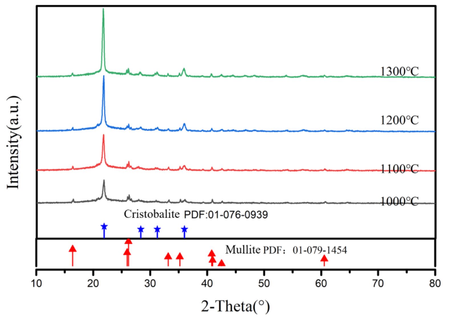 Fig. 9 shows XRD patterns of porous ceramics prepared from P2 at different sintering temperature. The crystalline phase in porous ceramics is mainly cristobalite and a small amount of mullite. The amount of cristobalite increases with the increase of sintering temperature, which suggests that porous silica ceramics can be prepared above 1000 °C.