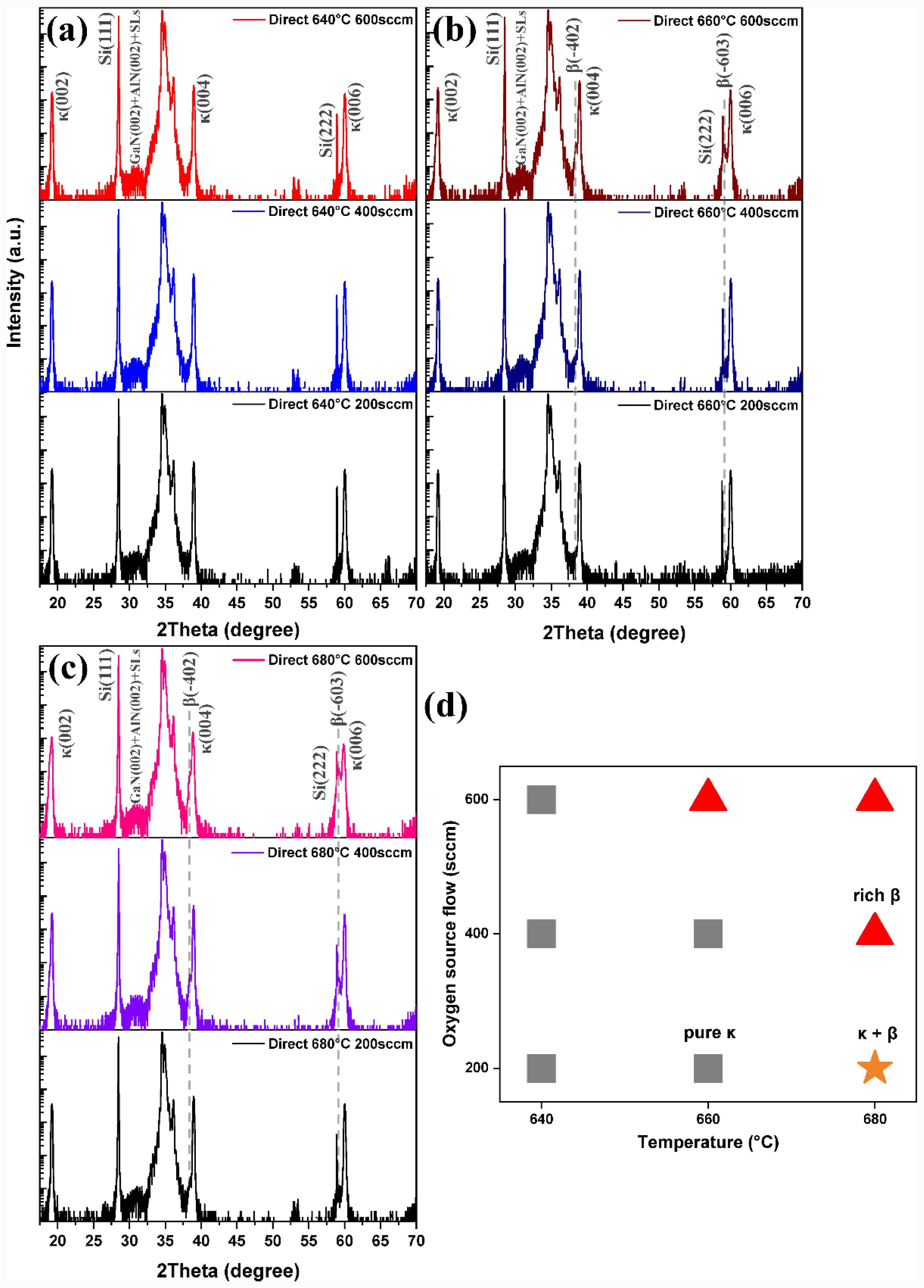 Fig. 1 (a-c) 2θ-ω scan XRD spectra of Ga₂O₃ thin films directly grown under various temperatures and H₂O flow rates. (d) Phase diagram summarizing κ/β phase evolution under direct growth conditions. |