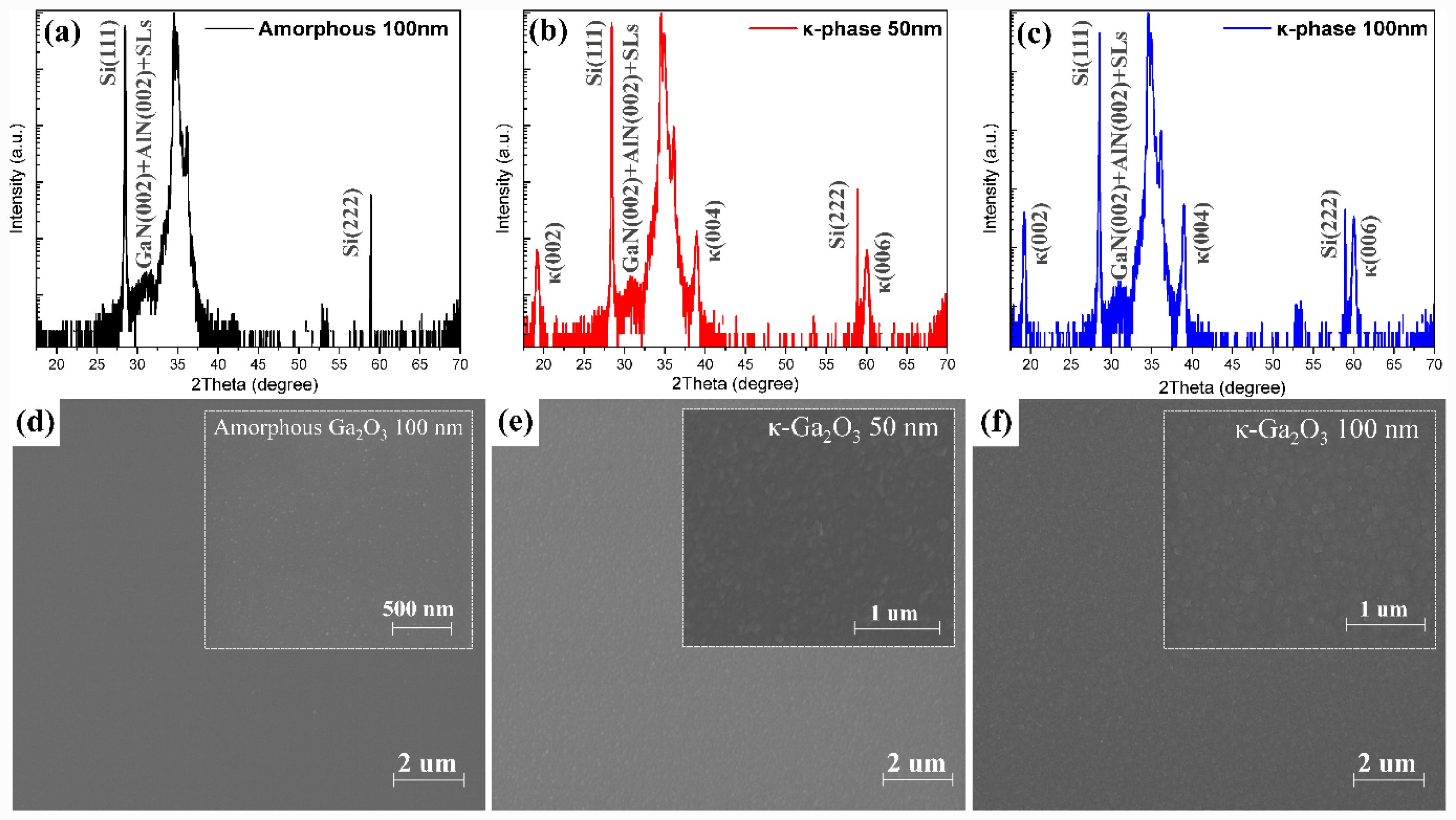 In heteroepitaxy, the two-step growth method is considered an effective approach to relieve lattice stress between the substrate and the film and to enable the growth of high-quality thin films. This technique, consists of a low temperature nucleation layer and a high temperature epitaxial layer, has been widely adopted for the growth of high-quality nitrides and oxides [29, 35, 36]. Previous studies have reported that during the initial growth stage of κ-Ga₂O₃ a thin transition layer or β-Ga₂O₃ nuclei tend to form [27, 28, 49]. This behavior is attributed to the initial stress caused by lattice mismatch between the substrate and the film under high growth temperatures. The resulting transition layer can be regarded as a structural accommodation that relieves interfacial strain. This early phase mixing often persists throughout the entire growth, leading to κ+β mixed-phase films. Therefore, it is crucial to suppress β-phase nucleation during the nucleation stage to achieve single-phase κ-Ga₂O₃ epitaxy. To address this, we systematically investigated the effect of different types and thicknesses of nucleation layers on the resulting film structure. Specifically, we prepared amorphous and crystalline κ-Ga₂O₃ nucleation layers with different thicknesses (50 and 100 nm) on GaN templates, followed by subsequent film growth. As shown in Fig. 2(a), the Ga₂O₃ film deposited at 500 °C exhibited no identifiable diffraction peaks. Consistently, the corresponding SEM image Fig. 2(d) revealed a very smooth surface composed of randomly oriented fine particles, confirming the formation of an amorphous nucleation layer at this temperature [37]. To stabilize single-phase κ-Ga₂O₃ and suppress β-phase formation, the nucleation temperature was set to 600 °C. When the κ-Ga₂O₃ layer was grown to a thickness of 50 nm Fig. 2(b), weak κ-phase peaks were observed, although the intensity was relatively low. In the SEM image of Fig. 2(e), the surface appeared very rough, the thin film was not sufficiently coalesced, and the grain arrangement was found to be disordered. In general, during the initial nucleation stage in the two-step growth method, the film grows in a three-dimensional (3D) mode [38]. In addition, according to the study by Narayanan et al., faulted regions formed in the nucleation layer act as one of the main sources of threading dislocations (TDs) [39]. In our case, the 50 nm nucleation layer appeared insufficient to suppress TD formation, leading to polycrystalline characteristics. On the other hand, as shown in Fig. 2(c), increasing the nucleation layer thickness to 100 nm resulted in the appearance of well defined κ-Ga₂O₃ diffraction peaks with enhanced intensity. The SEM image in Fig. 2(f) shows that the surface is smoother than that of the 50 nm condition, with reduced 3D island structures and a more ordered grain arrangement. This can be attributed to the fact that, as the thickness of the nucleation layer increases, surface coalescence is promoted, which is generally associated with improved crystal quality.