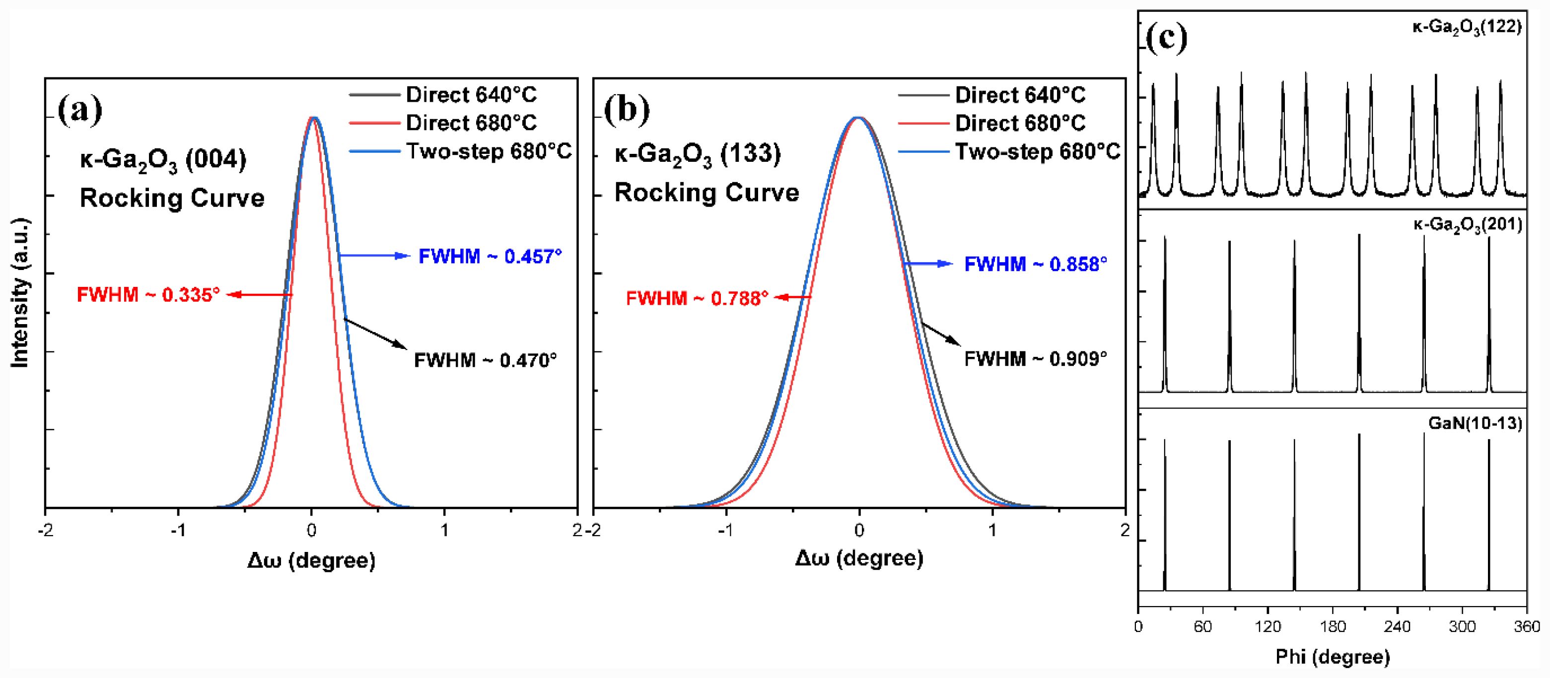 Fig. 5(a) and (b) present the rocking curve results for the κ-Ga₂O₃ (004) and (133) planes. According to the 2θ-ω scan data shown previously in Fig. 4, the full width at half maximum (FWHM) of the κ-Ga₂O₃ (004) peak was measured to be 0.195° for direct 640 °C, 0.223° for direct 680 °C, and 0.190° for two-step 680 °C samples. In contrast, the rocking curve measurements exhibited generally larger FWHM values, which were 0.470° for direct 640 °C, 0.335° for direct 680 °C, and 0.457° for two-step 680 °C. These broader values can be attributed to the formation of mosaic domains typically observed during heteroepitaxial growth, which induce out-of-plane tilt and in-plane twist of the lattice, thereby degrading overall crystalline alignment. The rocking curve method reflects this mosaic spread and thus tends to yield larger FWHM values than the 2θ-ω scans [40]. In this study, the GaN templates used were composed of multilayered structures, and it is presumed that the curvature of the substrate, combined with the large lattice mismatch (~8.8%) between κ-Ga₂O₃ and GaN contributed to the significant mosaic spread. Interestingly, the FWHM values of the single-phase κ-Ga₂O₃ samples (direct 640 °C and two-step 680 °C) were similar, whereas the mixed-phase (β + κ) sample grown at direct 680 °C showed a relatively smaller FWHM. This seemingly counterintuitive result has also been reported in previous studies. For example, S. H. Cho et al. observed that when the nucleation layer was composed of a β + κ mixed-phase, grain competition during subsequent epitaxial growth facilitated the formation of highly aligned κ-Ga₂O₃ films [41]. Similarly, S. Chen et al. reported that in the presence of a β + κ mixed-phase, β-Ga₂O₃ grains acted similarly to the masks in epitaxial lateral overgrowth (ELOG), promoting the lateral growth of κ-Ga₂O₃ grains [11]. Therefore, the mixed-phase nucleation layer observed in the direct 680 °C sample in this study is interpreted to have acted as a growth guide, where β-Ga₂O₃ crystals facilitated the lateral growth of κ-Ga₂O₃, thereby promoting more aligned κ-Ga₂O₃ growth.