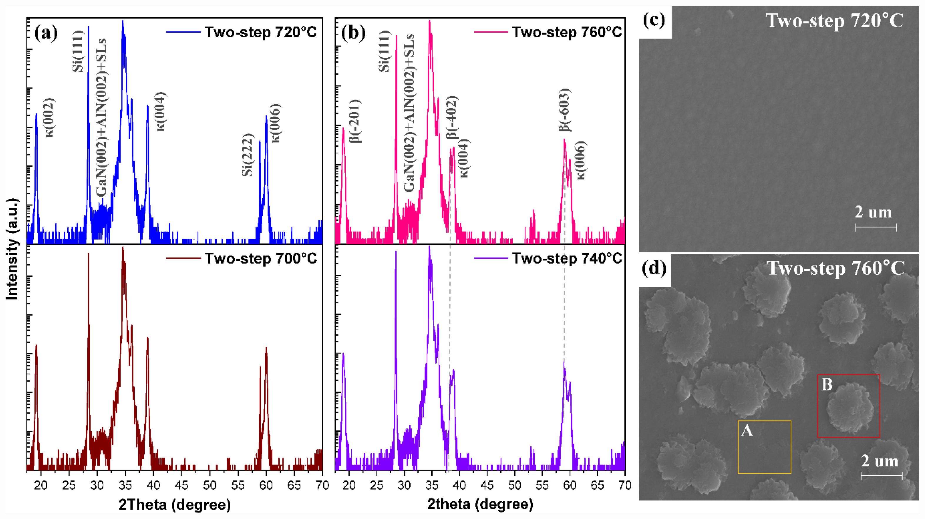 Based on the previous findings that the two-step growth process effectively suppresses the formation of the β-Ga₂O₃ phase during κ-Ga₂O₃ growth, it is necessary to determine the maximum epitaxial growth temperature at which a single-phase κ-Ga₂O₃ film can be maintained. Fig. 6(a) and (b) show the XRD analysis results of samples grown at various epitaxial temperatures ranging from 700 °C to 760 °C, in 20 °C increments. The results confirmed that the single-phase κ-Ga₂O₃ structure was retained up to 720 °C. Representative diffraction peaks within this temperature range appeared at κ-Ga₂O₃ (002) 19.2°, (004) 38.96°, and (006) 60.02°. In contrast, the β-Ga₂O₃ phase was only weakly detected as a shoulder on the lower-angle side of the κ-Ga₂O₃ (006) peak. As summarized in Table 2, the κ-Ga₂O₃ thin film reported in this study was grown at the highest temperature ever reported for a single-phase κ-Ga₂O₃ using the MOCVD process. However, when the growth temperature was increased to 740 °C or higher, a rapid phase transition to β-Ga₂O₃ occurred. The κ-Ga₂O₃ (002) peak at 19.2° disappeared, while a β-Ga₂O₃ (-201) peak emerged at 18.92°. Additional β-Ga₂O₃ (-402) and (-603) peaks also appeared to the left of the κ-Ga₂O₃ (004) and (006) peaks, with intensities comparable to or greater than those of the κ-Ga₂O₃. These findings demonstrate that, through the two-step growth method, single-phase κ-Ga₂O₃ can be achieved even beyond the previously reported thermal stability limit of ~700 °C. To analyze the sample grown at 720 °C, where single-phase κ-Ga₂O₃ was achieved, and to investigate the subsequent phase transition and morphological evolution at higher temperatures, SEM measurements were conducted. Fig. 6(c) presents the SEM result for the sample grown at an epitaxial temperature of 720 °C. The film exhibited a single-phase κ-Ga₂O₃ structure with a relatively smooth surface morphology. Fig. 6(d) presents the SEM image of the sample grown at 760 °C. The image reveals the presence of large island morphologies distributed across the surface, indicating insufficient coalescence between them. In contrast, regions where coalescence had already occurred exhibited relatively flat surface morphologies. This surface morphology can be explained by a mixed-phase formation mechanism. The low grain density of κ-Ga₂O₃ makes it difficult to achieve sufficient coalescence within a short growth period, leading to rough, island-shaped features such as those observed in region B. Conversely, the presence of β-Ga₂O₃ can induce epitaxial lateral overgrowth (ELOG), which promotes the lateral growth of κ-Ga₂O₃ crystals. As a result, relatively smooth surfaces are formed in coalesced areas like region A [11].