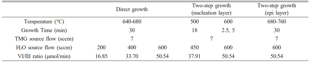 Ga₂O₃ thin films were epitaxially grown on GaN templates using a custom-built horizontal metal-organic chemical vapor deposition (MOCVD) system. The GaN template employed in this study was designed as a multilayer structure to ensure high crystalline quality. From bottom to top, the layer stack comprised a Si(111) substrate, a 200 nm AlN buffer layer, 1500 nm AlGaN/AlN superlattices (SLs), a 600 nm u-GaN, a 5 nm AlN, and a 1200 nm u-GaN top layer. The crystalline quality of the GaN template was confirmed by high-resolution X-ray diffraction (HRXRD), where the full width at half maximum (FWHM) of the GaN (002) rocking curve was measured to be approximately 1.3°. Trimethylgallium (TMG) was used as the Ga precursor and maintained at −10 °C. Ultra-pure deionized H₂O served as the oxygen precursor and was kept at room temperature. High-purity (6N) nitrogen (N₂) was used as the carrier gas. All growth processes were performed under atmospheric pressure. The TMG flow rate was fixed at 7 sccm (17.05 μmol/min) throughout all experiments. The single-step growth process is referred to as direct growth, where the Ga₂O₃ thin film was deposited directly on the GaN surface. Growth temperatures were varied from 640 to 680 °C in 20 °C intervals, with a fixed growth time of 30 min. The two-step growth process involved a nucleation step followed by an epitaxial growth step. In the nucleation step, Ga₂O₃ films were grown under three different conditions with varying temperatures and thicknesses. In the second step, the epitaxial growth was carried out for 30 min at temperatures ranging from 680 to 760 °C in 20 °C increments. Detailed process parameters are summarized in Table 1. The crystal structure and phase composition of the grown films were evaluated by high-resolution X-ray diffraction (HRXRD, RIGAKU) using a two-bounce Ge(220) monochromator with Cu Kα₁ radiation. Phase identification was performed via 2θ-ω scans, while crystal quality and threading dislocation density were evaluated using ω-scans (rocking curves). The crystallographic orientation and in-plane alignment were investigated using azimuthal (Φ-scan) measurements. Surface morphology and film thickness were characterized using field emission scanning electron microscopy (FE-SEM, Tescan CLARA). Atomic force microscopy (AFM, Park Systems) was employed to evaluate the surface roughness and growth mode of the films.