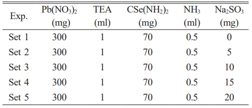 PbSe films were synthesized using CBD. Glass substrates were cleaned with alcohol, rinsed with deionized water, and immersed in 100 mL of deionized water in the bath vessel. The precursor solution was prepared by dissolving 300 mg of Pb(NO₃)₂, followed by the sequential addition of 1 mL triethanolamine (TEA), 0.5 mL ammonia (NH₃), and 70 mg selenourea (CSe(NH₂)₂). The first film was synthesized without an inhibitor, whereas subsequent films were produced by adding Na₂SO₃ in amounts of 5, 10, 15, and 20 mg. The produced films were named as Set 0, Set 1, Set 2, Set 3, and Set 4 according to the concentration of Na₂SO₃ added to the solution. For all films, the deposition periods were 60 minutes, the solution temperature was 23 °C, and the pH was 10.5. A summary of the reaction parameters is provided in Table 1.