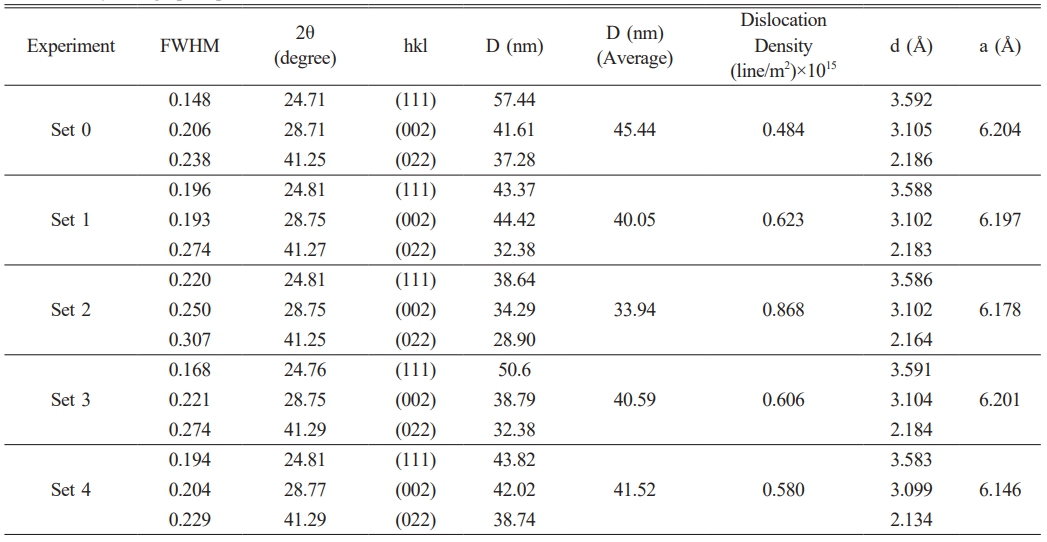 Here, (hkl) are the Miller indices, d is the interplanar spacing, and a is the lattice parameter [30]. As given in Table 2, the parameter values of the lattice of the films were calculated to be between 6.146 and 6.204. Since these values exceed the standard value of 6.122 provided by the ASTM card, it can be inferred that the films are under stress.