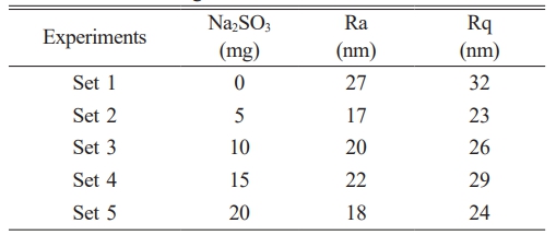 Film thicknesses obtained from SEM images are presented in Fig. 1, with the minimum thickness of 855 nm observed in the reference experiment and the maximum thickness of 2955 nm observed in Set 3. At the end of the experiment, a substantial amount of chemical residue was observed in the reference bath. The residue decreased noticeably in the bath containing 10 mg of inhibitor; however, further increasing the inhibitor concentration resulted in an increase in residue formation. This phenomenon is attributed to heterogeneous nucleation occurring when 10 mg of Na₂SO₃ is used, which is consistent with literature reports emphasizing the role of surface energy manipulation in improving crystallization outcomes [24].