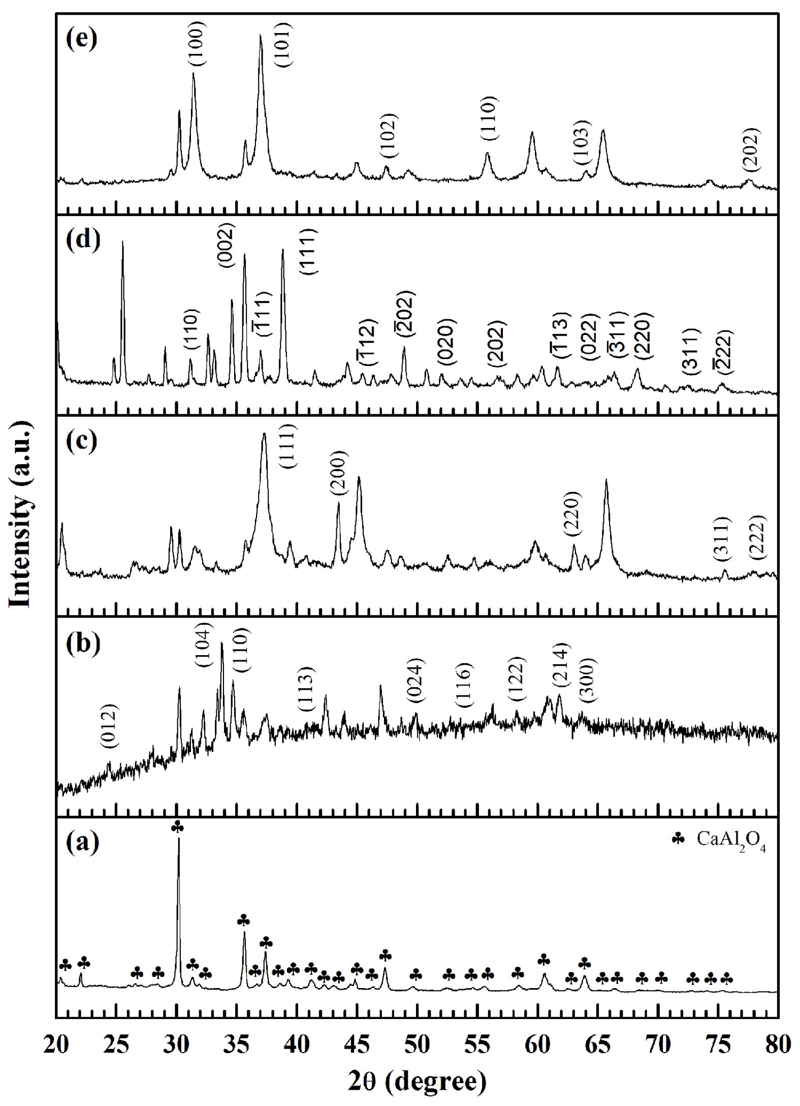 X-ray diffraction (XRD) analysis was employed to examine the crystal structures and phase formations of the pure CaAl2O4 powders along with the modified samples doped with iron, nickel, copper, or zinc ions. Figure shows the resulting patterns associated with CA (Fig. 1a), Fe-CA (Fig. 1b), Ni-CA (Fig. 1c), Cu-CA (Fig. 1d), and Zn-CA (Fig. 1e). For the pure CaAl2O4 sample, significant diffraction peaks could be observed at 2θ values from 20° to 80° which were linked to the (112), (020), (211), (122), (220), (212), (031), (303), (025), (313), (032), (400), (132), (035), (313), (226), (240), (143), (414), (404), (432), (441), (343), (061), (344), and (411) planes [24]. The findings align with expectations from the standard data insofar as a cubic spinel structure (AB2O4) is present within the space group (JCPDS file No. 53-0191 and 23-1036) [25]. The diffraction peaks are both clear and distinctive, indicative of the long-range ordered structure type which would be expected for trimetallic oxide powders. All observed diffraction peaks for the CaAl2O4 phase were apparent in the XRD spectra for each of the modified samples, although the addition of iron content to CaAl2O4 resulted in a reduction in the peak intensity, suggesting that the crystallinity of the modified samples was decreased. Furthermore, diffraction peaks were visible at 2q = 24˚, 33.5˚, 34.5˚, 41˚, 50˚, 53.5˚, 58˚, 62˚ and 64˚ in the diffraction pattern of the Fe-CA sample, clearly revealing the formation of the cubic α-Fe2O3 phase (JCPDS file no. 89-0598) [26]. The diffraction peaks for the nickel-doped sample, Ni-CA, of 2q = 37.3˚, 43.4˚, 63˚, 75.6˚, and 78˚ correspond directly to the (111), (200), (220), (311) and (222) reflections of the face-centered cubic rock salt NiO (JCPDS file no. 22-1189) [27]. The addition of copper ions to the calcium aluminate matrix produced peaks in the XRD diffraction pattern which emerged clearly at 2q = 32.5˚, 35.7˚, 36˚, 39˚, 46.5˚, 49˚, 52.2˚, 57˚, 61.8˚, 65˚, 66.5˚, 68.2˚, 72.5˚, and 75.3˚, linked to the respective Miller indices of (110), (002), (-111), (111), (-112), (-202), (020), (202), (-113), (022), (-311), (220), (311), and (-222). This particular pattern was previously indexed as the tenorite phase of monoclinic CuO (JCPDS file no. 48-1548) [28]. When adding zinc, the diffraction peaks were very distinctive, emerging at 2q = 31.8˚, 37.1˚, 47.6˚, 56˚, 64˚, and 77.2˚, associated with the respective diffraction planes of (100), (101), (102), (110), (103), and (202). These correspond to the zincite phase of hexagonal wurtzite ZnO (JCPDS file no. 36-1451) [29]. In the case of the CaAl2O4 systems doped with transition metals, the XRD patterns indicate peak locations which indicate that the addition of the iron, nickel, copper, or zinc ions does not create a solid solution with calcium aluminate, and instead produces fully formed nanocomposites of Fe2O3/CaAl2O4, NiO/CaAl2O4, CuO/CaAl2O4, and ZnO/CaAl2O4 with no impurity phases.