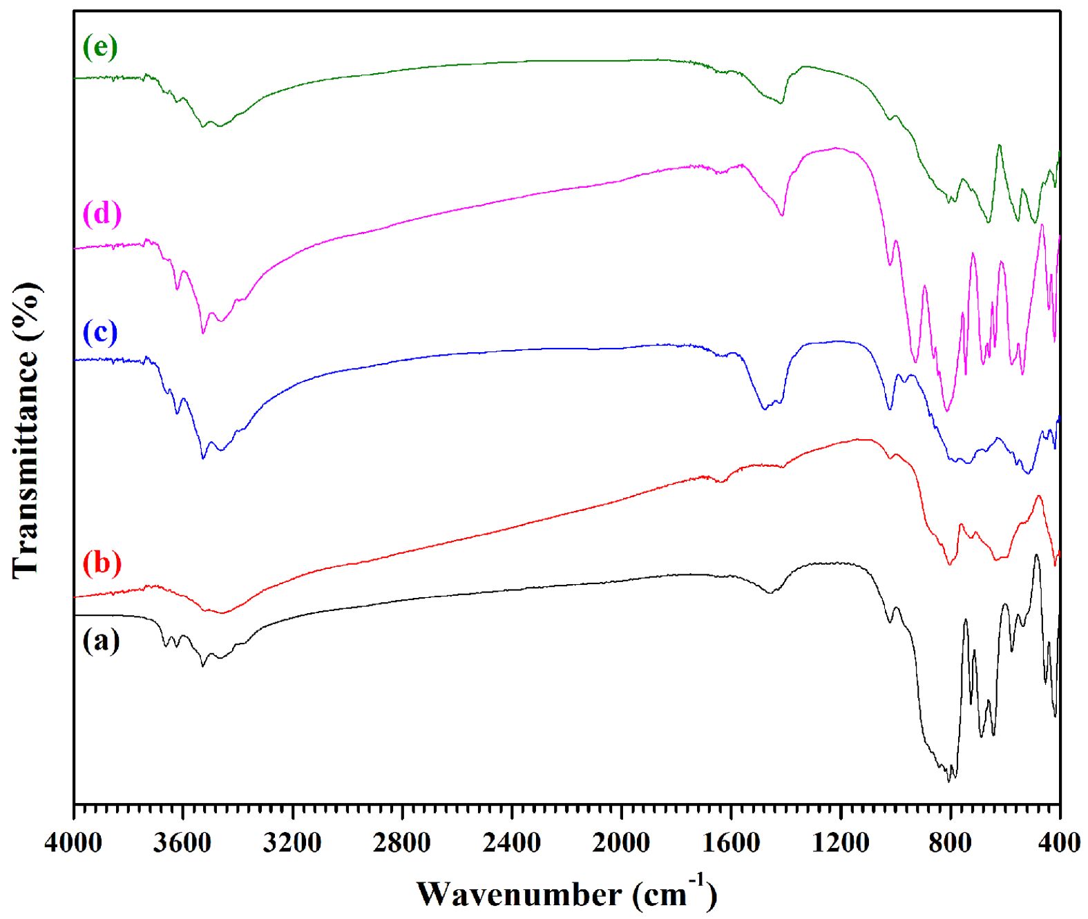 The surface functional groups for the various powders of CA, Fe-CA, Ni-CA, Cu-CA, and Zn-CA were investigated via the Fourier transforms infrared (FT-IR) spectra. It is possible to identify the compound constituents through this technique by examining the absorption frequency characteristics. Fig. 2 shows the FT-IR spectra for each of the samples across a range from 400 cm-1 to 4000 cm-1. It is necessary to consider for analysis three main phases of the FT-IR spectra. The first is absorption from 3400 cm-1 to 3700 cm−1 due to -OH stretching vibrational modes, including the bending vibrational mode of absorbed molecules of water [30]. Second is the weak absorption band observed around 1650 cm−1 due to H-O-H bending vibrations [31]. Most impurity groups occur in this range, including -OH,