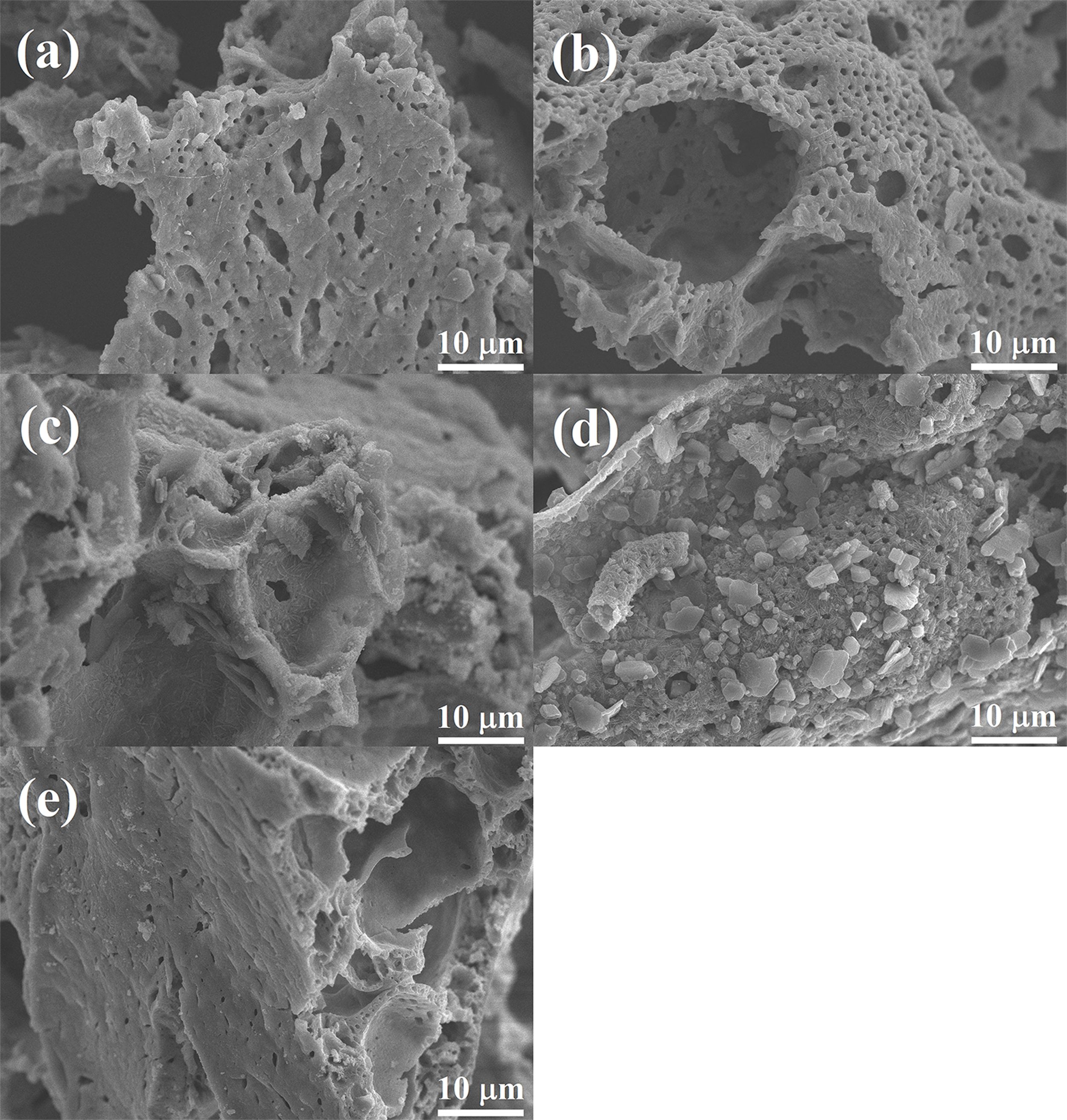 Fig. 3 SEM images at 10000× magnification of (a) CA, (b) Fe-CA, (c) Ni-CA, (d) Cu-CA, and (e) Zn-CA powders. |