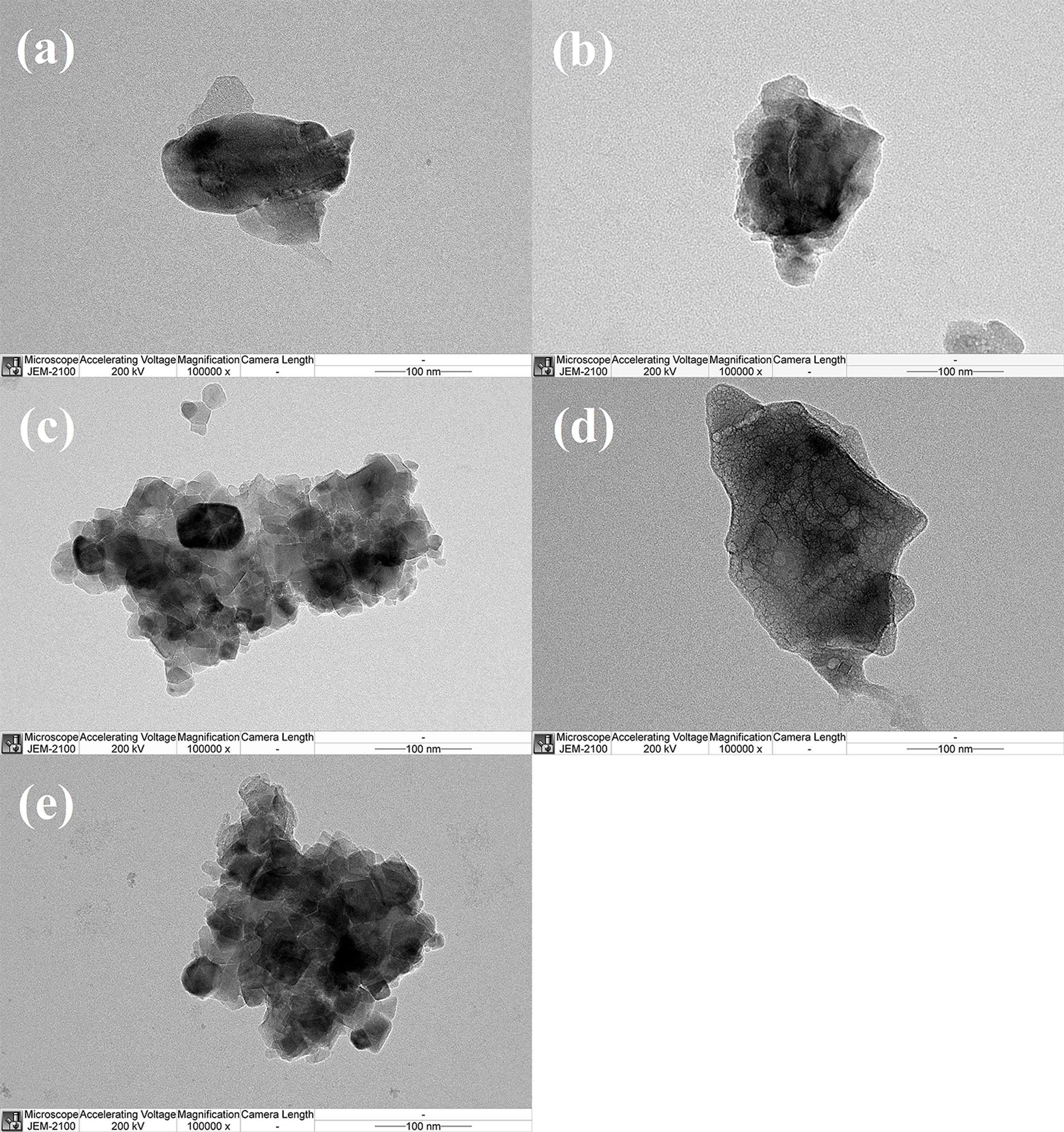 Fig. 4 TEM images at 100000× magnification of (a) CA, (b) Fe-CA, (c) Ni-CA, (d) Cu-CA, and (e) Zn-CA powders. |