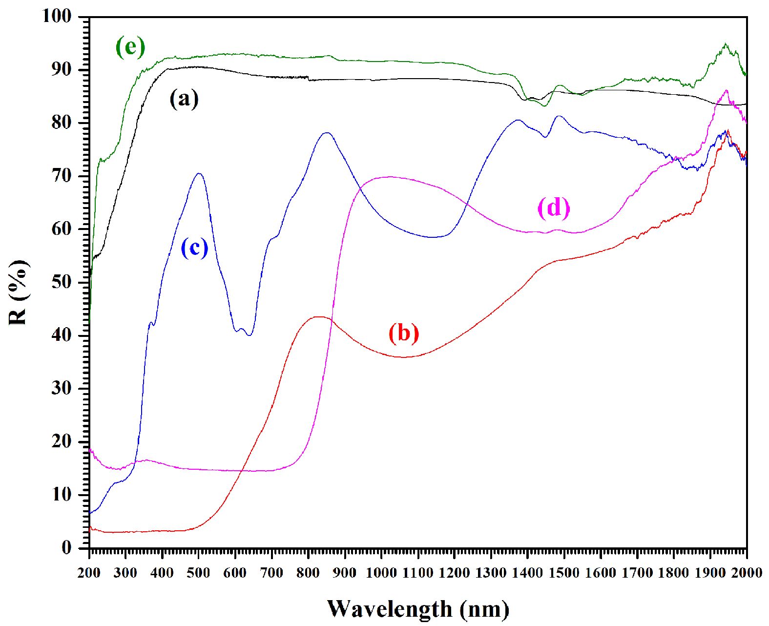 Figure 5 presents the ultraviolet diffuse reflectance spectra (UV-DRS) spectra for the pure CaAl2O4 powders and the samples doped with iron, nickel, copper, and zinc ion. The visible absorption peaks confirm electron transition from valence to conduction bands, and are sometimes indicative of intrinsic defect levels [41]. Fig. 5a presents the pure sample which reveals absorbance at 200 nm to 380 nm in the UV region, with reflectance measuring 50-88%. In the VIS region, from 380 nm to 700 nm, and into the NIR region from 800 nm to 1200 nm, the reflectance increases to as much as 88-91%. However, it begins to decrease further into the NIR region from 1200 nm to 2000 nm, dropping to 83-85%. For samples modified using iron, nickel, or copper, the UV-VIS-NIR region reveals reduced reflectance. Figs. 6b, 6c, and 6d show the results for Fe-CA, Ni-CA, and Cu-CA respectively. In the UV region, however, these modified samples presented minimal reflectance as follows: Fe-CA (3%) < Cu-CA (15-19%) < Ni-CA (7-43%). In the UV regions, typical absorption bands could be observed as a consequence of band-to-band electron transitions which link full O 2p orbitals and empty Al 3s, along with the possibility of Al 3p wave function mixing [42]. These samples also produced one further shoulder at 350 nm, which was indicative of electronic excitation arising between full metal ion O 2p orbitals and empty 4s orbitals [43]. The reflectance results for the VIS region differed in the case of the modified samples when comparisons to the pure sample were drawn. The Ni-CA sample produced three smaller bands located around 370 nm, 590 nm, and 630 nm, which provide confirmation of the NiO structure formation, for which the minimum reflectance level was 40%. In addition, a high-energy band appeared at 370 nm due to the charge transfer bands and 3A2g-3T1g spin. This permitted transition which resulted in the octahedral coordination of the Ni2+ cations [44]. Further bands were present at 590 nm and 630 nm due to the 3T1-3T2 (3P) spin permitting transition. The doublet d-d bands appear as a result of the Ni2+ occurring at both the tetrahedral and octahedral sites [45]. In the case of Cu-CA, the UV-DRS spectrum displayed a broad absorption band responsible for 14-17% reflectance, encompassing the VIS spectra with no other notable features. An additional band appears at 400 nm to 500 nm, as a consequence of the charge transfer arising between the O and Cu2+ occupied octahedral sites. Moreover, a broad shoulder appears at around 600 nm to 700 nm due to Cu2+ d-d transitions taking place inside the tetragonally-distorted octahedral geometry of the Cu2+ ions [45]. For the sample modified with iron, the reflectance spectra for the VIS region measured around 3-4% at wavelengths of 380 nm to 500 nm. Toward the end of the VIS region, the reflectance increased to 5-26%. These bands appear because of the intrinsic band gap absorption which is a consequence of pair excitations in addition to local crystal field transitions [46]. For Zn-CVA, however, the UV reflectance exceeds that of the pure sample, maintaining a range of 85-92% in the VIS and NIR regions. Although the sample modified with zinc produces absorption peaks in the NIR region which match those of the pure sample, this did not occur for the samples doped with iron, nickel, or copper. The intensity of the absorption bands clearly rose in the range of 800 nm to 2000 nm upon the addition of copper or nickel, until minimum reflectance reached about 58% for the samples of Ni-CA and Cu-CA. In the iron-doped sample of Fe-CA, absorption efficiency was increased in the NIR region, and the minimum reflectance was 37%. This might be due to the effects of particle size in addition to the various oxides which are present, causing the optical spectra to broaden [47]. At the end of the VIS region and in the opening of the NIR region, the highest absorption efficiency was observed for Cu-CA, but when considering all wavelengths, the best performance was achieved by Fe-CA.