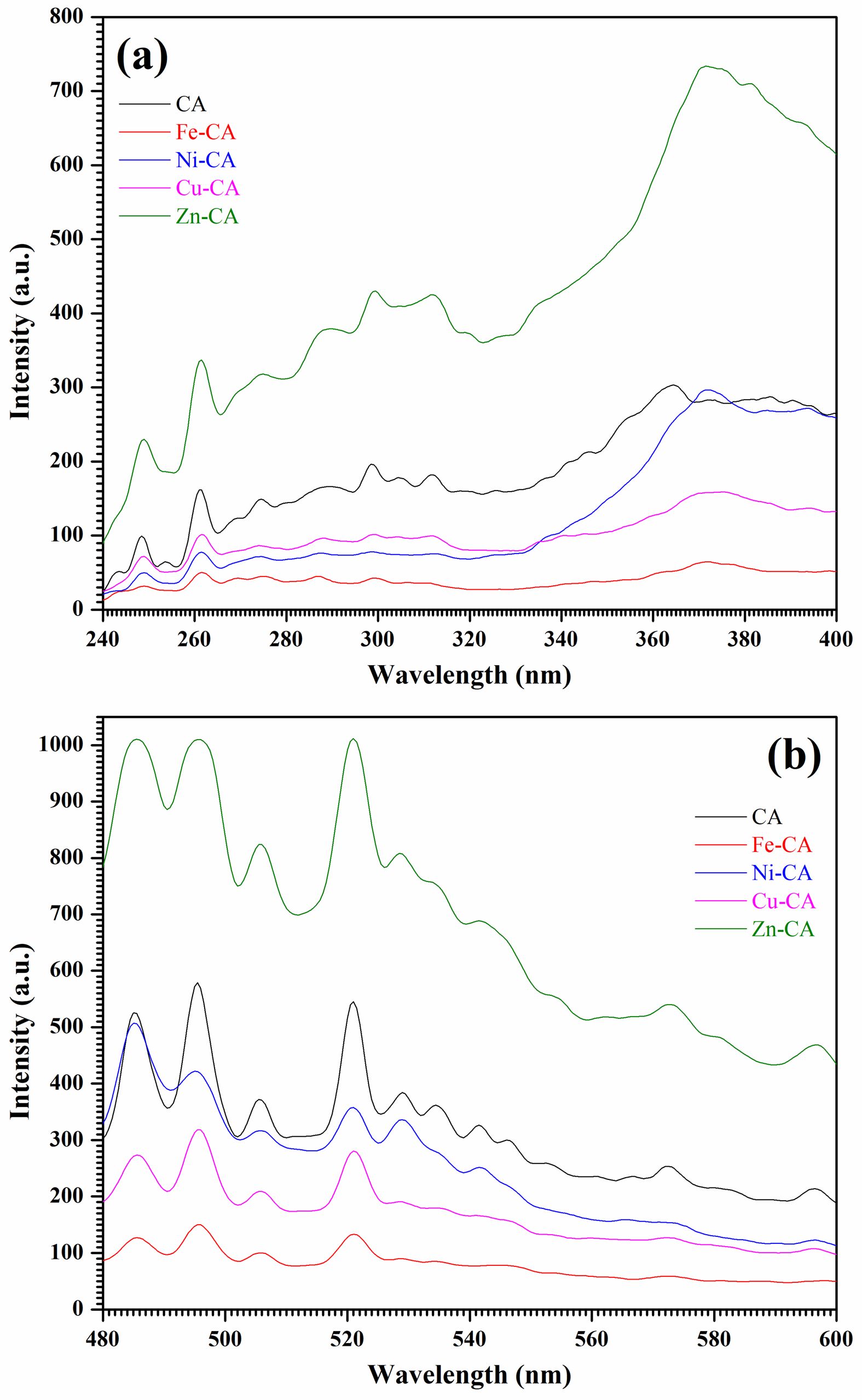 Recombination taking place in semiconductors is observable through the photoluminescence (PL) spectra, since band gap data are provided along with details about sub-bandgap defect states and the relative energy position [59]. There are variations apparent in material defects when the synthesis conditions differ, or if the crystallite dimensions and morphology vary [60]. Fig. 8 presents the CA, Fe-CA, Ni-CA, Cu-CA, and Zn-CA powder PL spectra under normalized room temperature conditions, encompassing the ultraviolet and visible regions in Figs. 8a and 8b respectively. An excitation wavelength of 220 nm was then used to examine the different emission bands. In each sample, a number of emission peaks were visible in the PL spectra which could be attributed to electron recombination and photogenerated holes, and which covered a range of structural defects including oxygen or metal vacancies, oxygen antisites, metal interstitials, and the ionized charge states linked to intrinsic defects [61]. Structural defects can easily occur due to the rapid combustion phase in the sol-gel approach, and these can subsequently serve as deep defect donors within the various semiconductor oxides, leading to optical emissions [62]. The PL spectrum for pure calcium aluminate presented continuous ultraviolet, violet, blue, and green emissions at around 360-400 nm, 485 nm, 495 nm, 520 nm, and 530-540 nm, while yellow and orange emissions of lower intensity were seen from 560 nm to 600 nm. It is not yet possible to identify the exact source of these defect-related emissions as the details remain rather complex, despite comprehensive studies of photoluminescence properties [63]. When iron, nickel, and copper ions were added, the emissions of the resulting Fe-CA, Ni-CA, and Cu-CA samples deteriorated in every region. Kazarinov et al. explain that the lower levels of photoluminescence intensity may be due to additional states created through anion vacancy and oxygen defects, because these tend to draw electrons and cause separation of the electron hole recombination [64]. However, in the case of the Zn-CA sample, the emission bands exhibit twice the intensity value of the pure sample and are much stronger. The PL peak intensity depends on how many charge transfers and surface defects are involved. There is also an effect exerted by residual organic materials such as NO3- and CO2 which the FT-IR analysis revealed to be present [65].