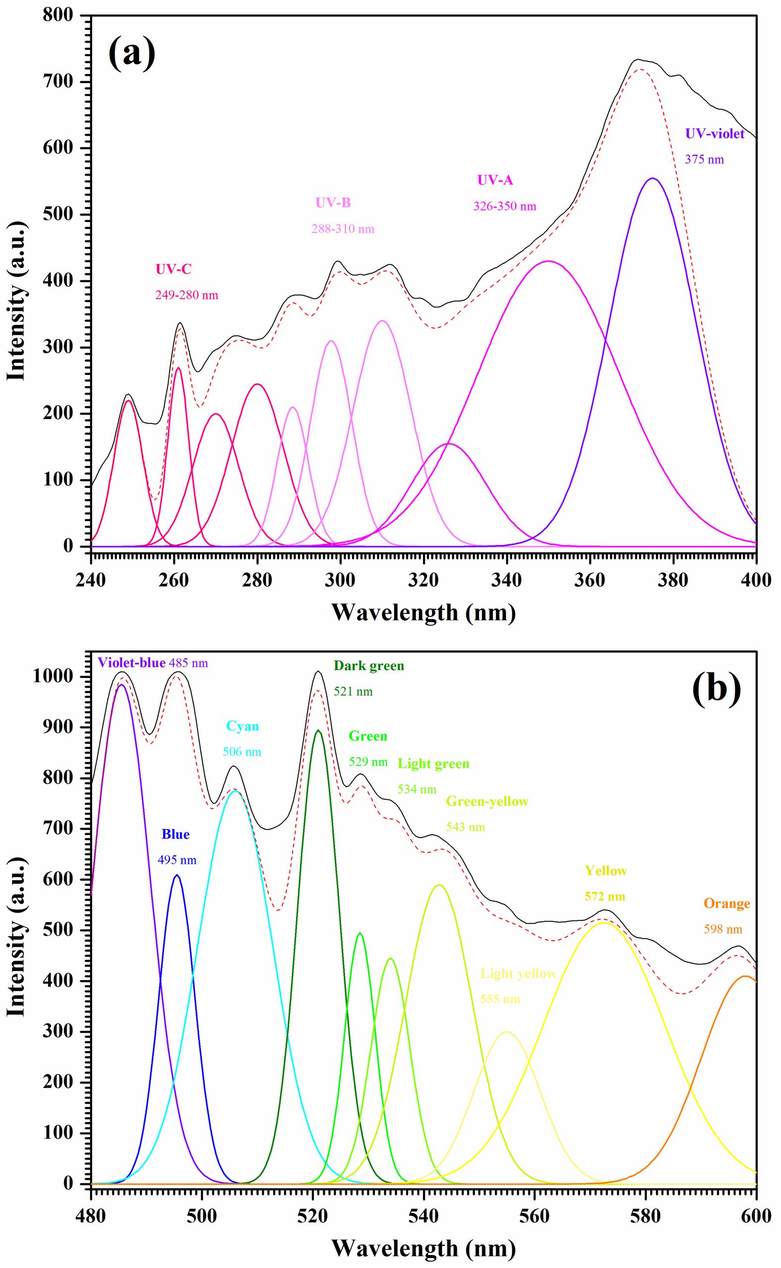 The deconvolution of the transition metal-doped calcium aluminate powders can be seen in Fig. 9. The ten Gaussian parts within the UV and VIS regions, shown respectively in Figs. 9a and 9b, reveal a good fit, with the data shown as follows: 249-280 nm (UV-C), 288-310 nm (UV-B), 326-350 nm (UV-A), 375 nm (UV-violet), 485 nm (violet-blue), 495 nm (blue), 506 nm (cyan), 521 nm (dark green), 529 nm (green), 534 nm (light green), 543 nm (green-yellow), 555 nm (light yellow), 572 nm (yellow), and 598 nm (orange).