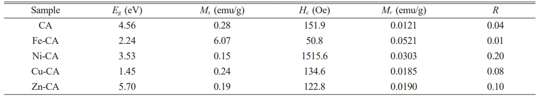 Table 1 Band gap values (Eg), specific saturation magnetization (Ms), coercivity (Hc), specific remanence magnetization (Mr), and remanence ratio (R) of pure CaAl2O4 powders and its composites with Fe, Ni, Cu, and Zn ions. |