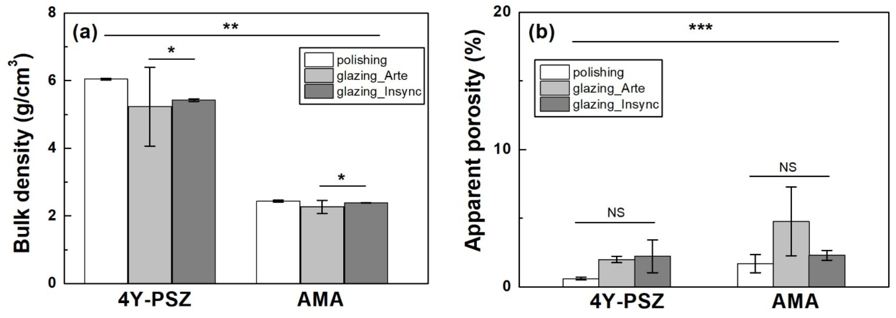 The experimental results of the bulk density and porosity of various samples are shown in Fig. 3. The bulk density of the sample was affected by the material type (partial eta-squared, hp2=0.998, p < 0.001), surface treatment (hp2=0.873, p < 0.001), and interaction between the material type and surface treatment (hp2=0.766, p < 0.001). Tukey’s post-hoc analysis showed a significant difference between polishing and glazing (p < 0.001), and a difference was evident between the Arte and Insync glazes (p = 0.038). Thus, the null hypothesis that the material type and surface treatment did not affect the bulk density of 4Y-PSZ and AMA ceramics was rejected.