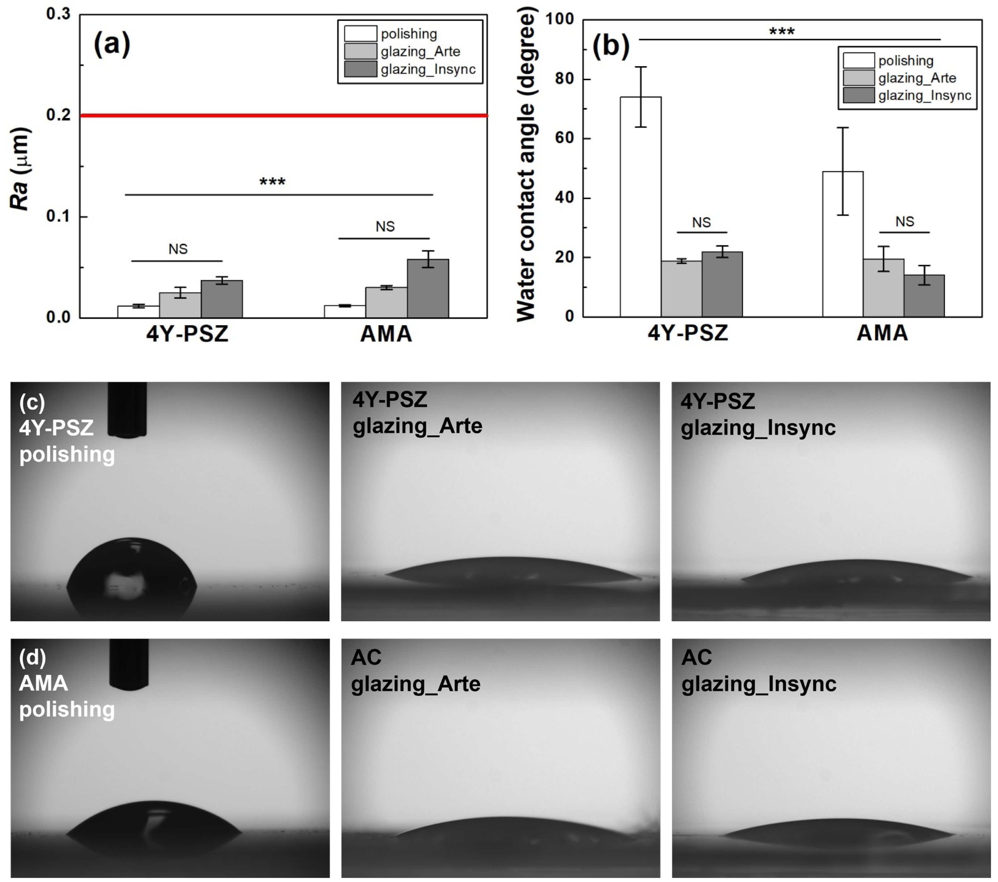 Fig. 4 Changes in (a) Ra and (b) WCA of the various samples based on the surface condition. WCA images of the (c) 4Y-PSZ and (d) AMA ceramics with various surface treatments. Statistical significance is indicated by *** (p < 0.001, n = 5). NS indicates statistically insignificant. |