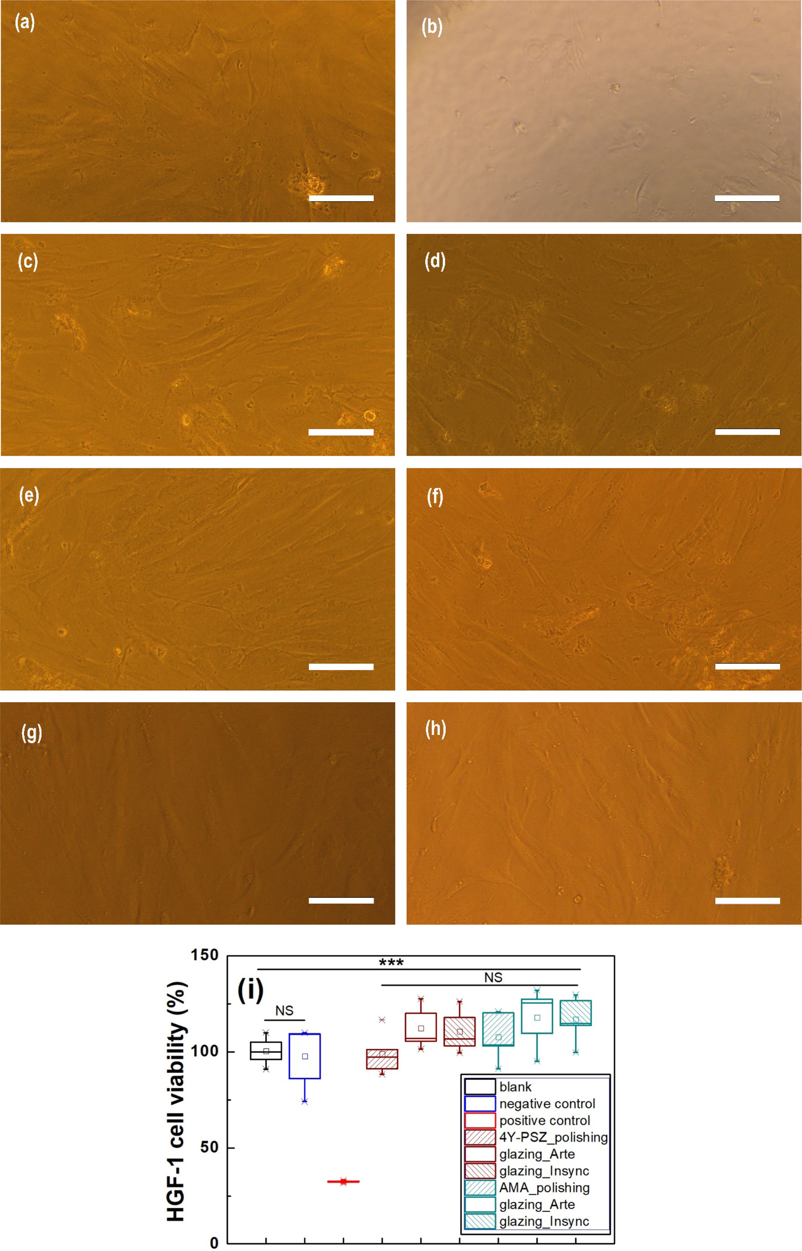 Fig. 5 HGF-1 cell morphology images: (a) negative control, (b) positive control, (c)(f) polished 4Y-PSZ and AMA ceramics, (d) (g) Arte-, (e)(h) Insync-glazed 4Y-PSZ and AMA ceramics, respectively, after 48 h of exposure to suspension in EZ-cytox. (i) Box plot of the HGF-1 cell viability in various samples. Statistical significance is indicated by ***, p < 0.001 (n = 5). NS indicates statistically insignificant. Scale bar is 100 μm. |
