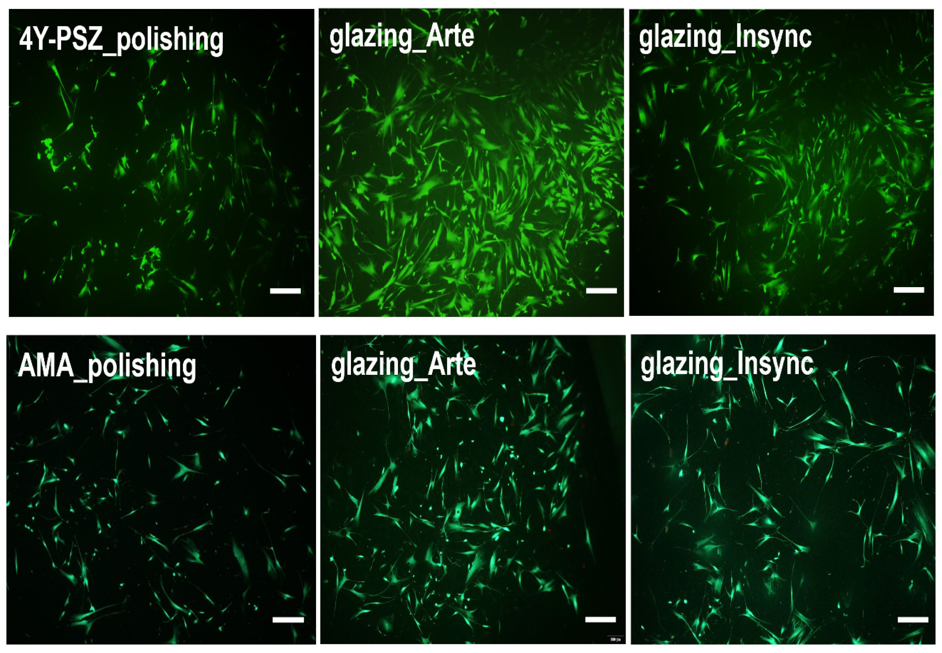 In this study, the cytocompatibility and bacterial resistance of two types of specimens (4Y-PSZ and AMA) manufactured through polishing or Arte-glaze treatments were investigated. Experimental data from the Arte-glaze samples were compared with previously published data [11]. The null hypothesis was that the surface treatments (polishing and glazing) did not affect the surface properties, cytocompatibility, and antibiofilm formation of 4Y–PSZ and AMA ceramics.