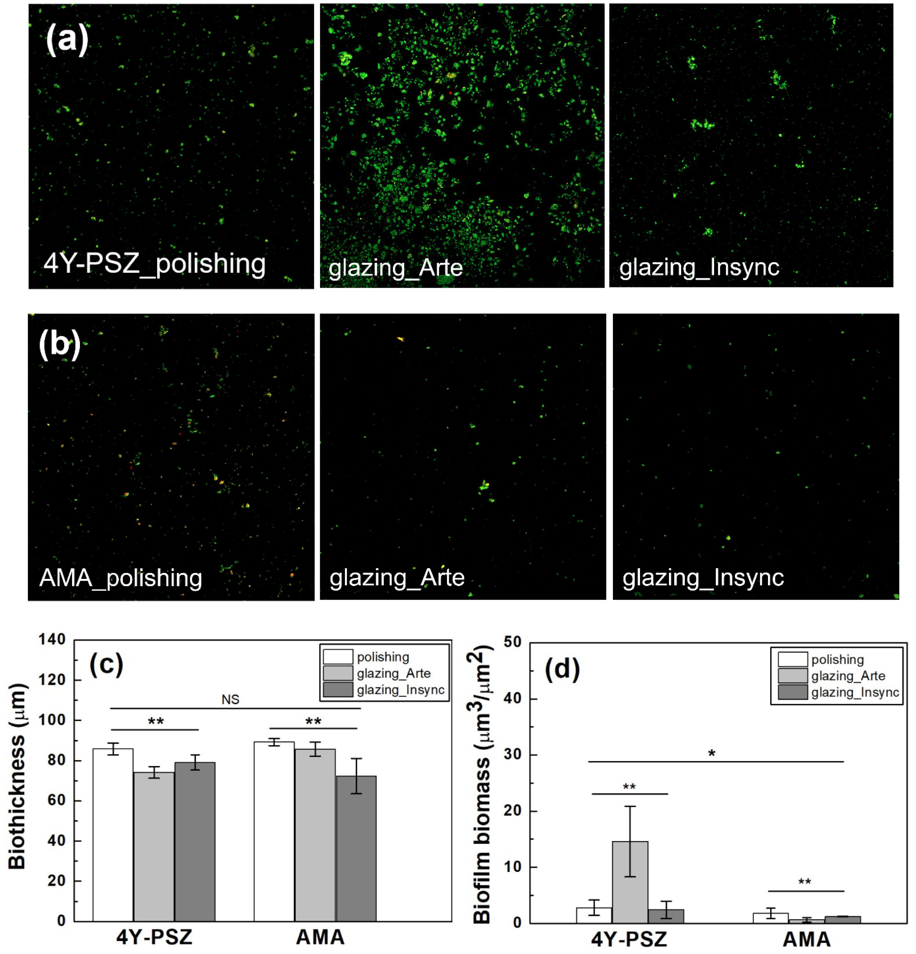 Fig. 7 (a) Live/dead staining images of the bacteria attached to the surfaces of the (a) 4Y-PSZ and (b) AMA specimens. Quantitative analysis of the (b) biothickness and (c) biomass of the biofilms. Statistical significance is indicated by * (p < 0.05) and ** (p < 0.01, n = 5). NS indicates statistically insignificant. |
