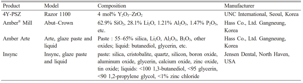 Notably, Amber® Mill Abut–Crown (AMA, Hass Co., Ltd., Gangneung, Republic of Korea) is commercially available as a monolithic ceramic block (Fig. 1). It consists of a titanium abutment and link, ZrO2 ceramic coping, LD glass ceramic, and leucite ceramic for the hole keeper [11]. Previous studies have shown that Insync (Jensen Dental, North Haven, Connecticut, USA)-glazed 4Y–PSZ and AMA (LD) samples exhibited superior human gingival fibroblast (HGF–1, NCTC Clone 929, ATCC, Manassas, VA, USA) and L–929 (Korea Cell Line Bank, Seoul, Republic of Korea) fibroblast attachment and proliferation, improved soft tissue sealing around the dental implants, and reduced biofilm biomass compared to the polished samples [11]. However, no study has compared Arte-glaze specimens (Hass Co., Ltd.) with other specimens.