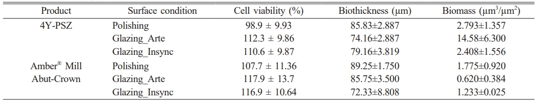 Table 2 Cell viability, biofilm biothickness, and biomass of 4Y-PSZ and AMA ceramics. |