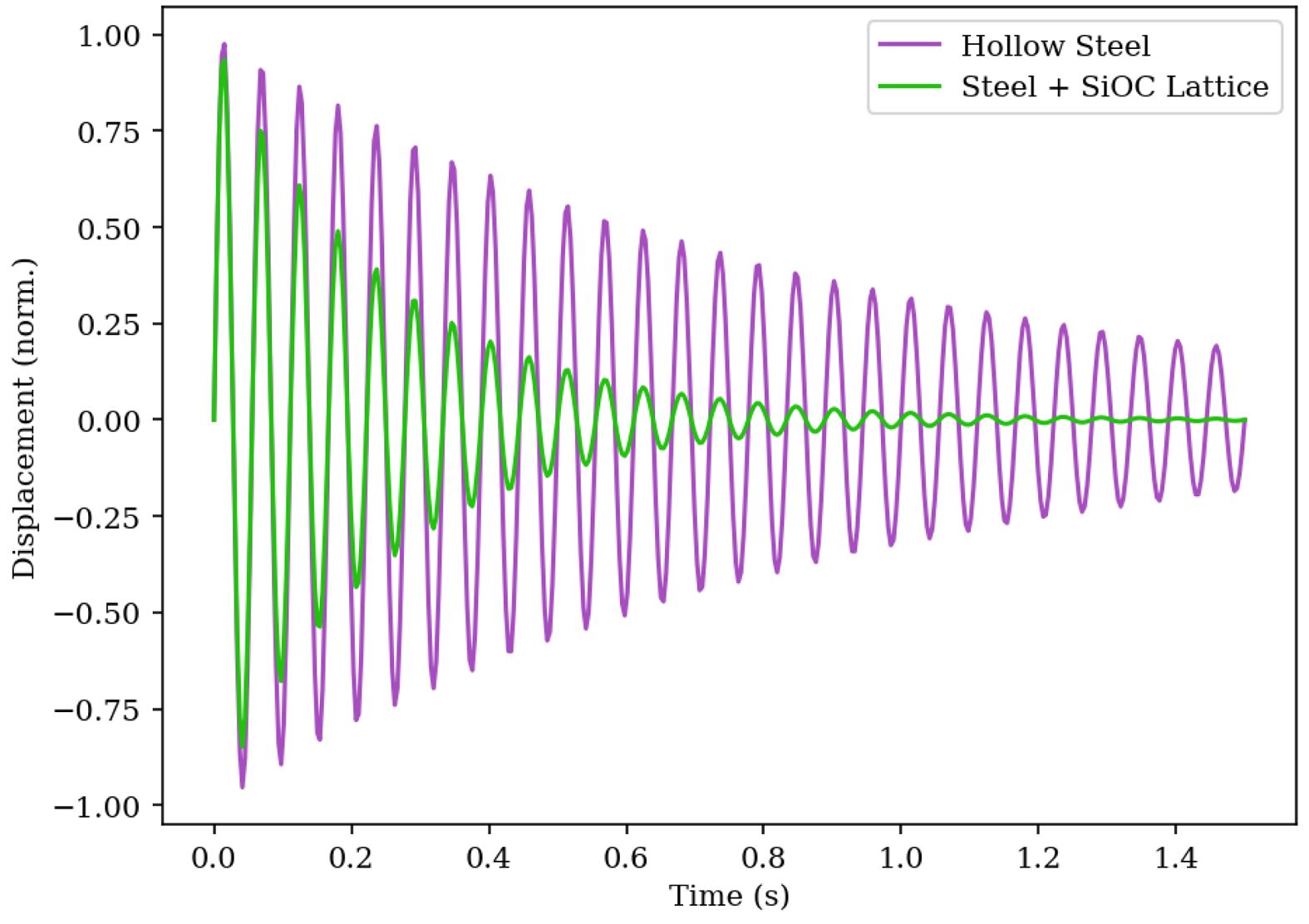 Fig. 1 Time-domain vibrational decay response of the beam for hollow steel and steel+SiOC configurations under identical excitation conditions. |